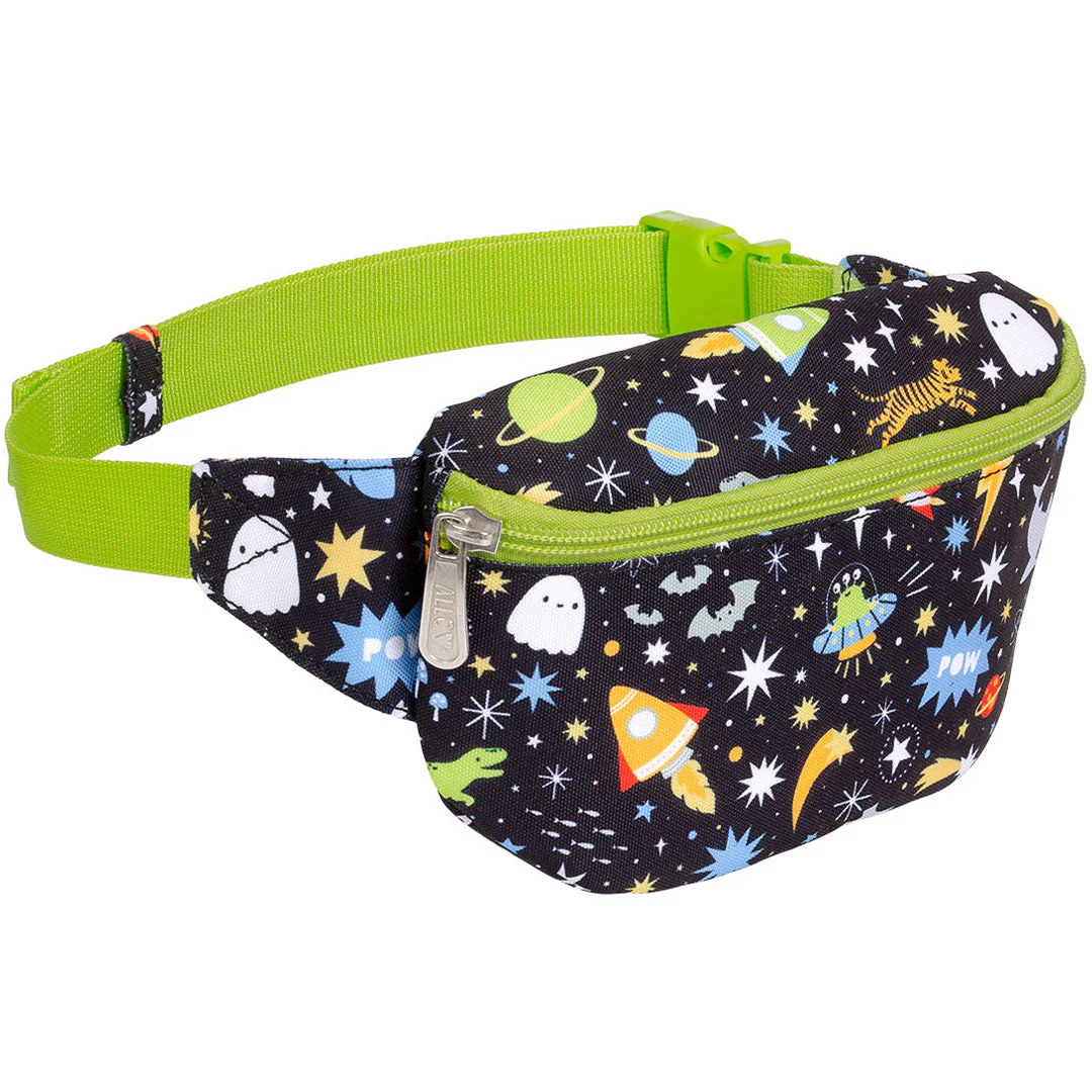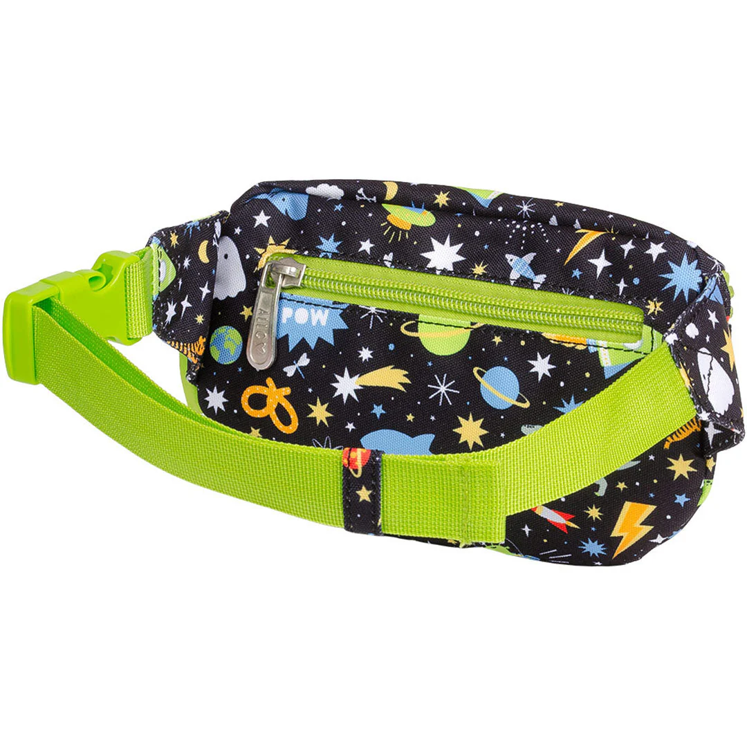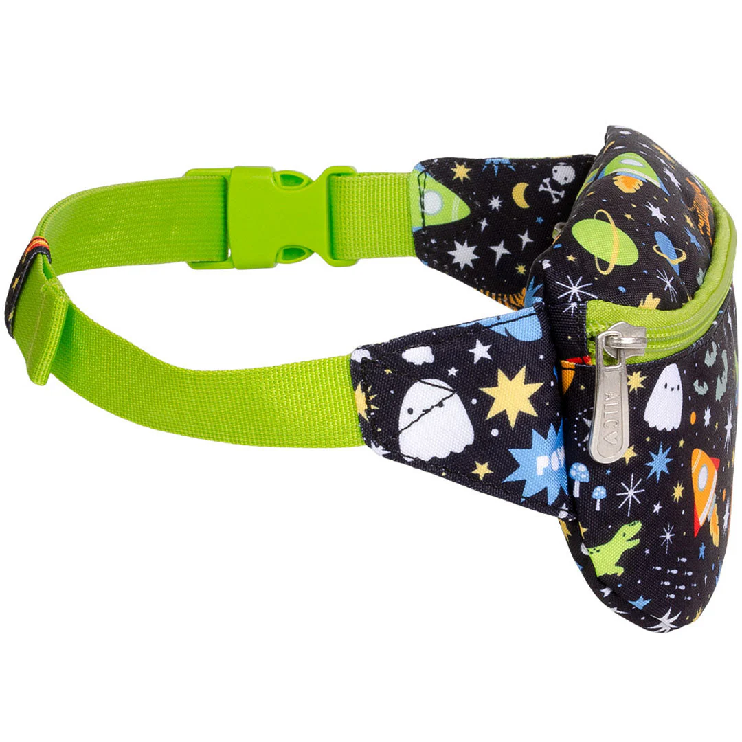 Met een magische mix van figuren uit het universum zoals raket en planeten voelt elke dag als een avontuur. De rits opent een wereld vol opbergruimte. De verstelbare band zorgt voor een comfortabele pasvorm, of je de zwart met groene heuptas nu om je middel draagt of schuin over de schouder.