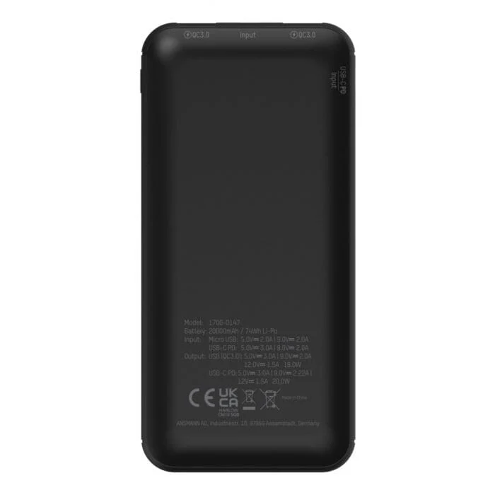 Externe reserveaccu met een vermogen tot 20 watt. Geschikt voor snelladen met 2 USB-A-poorten (Quick Charge 3.0) en een USB type-C-poort (Power Delivery (PD)) evenals een capaciteit van 20000 mAh.