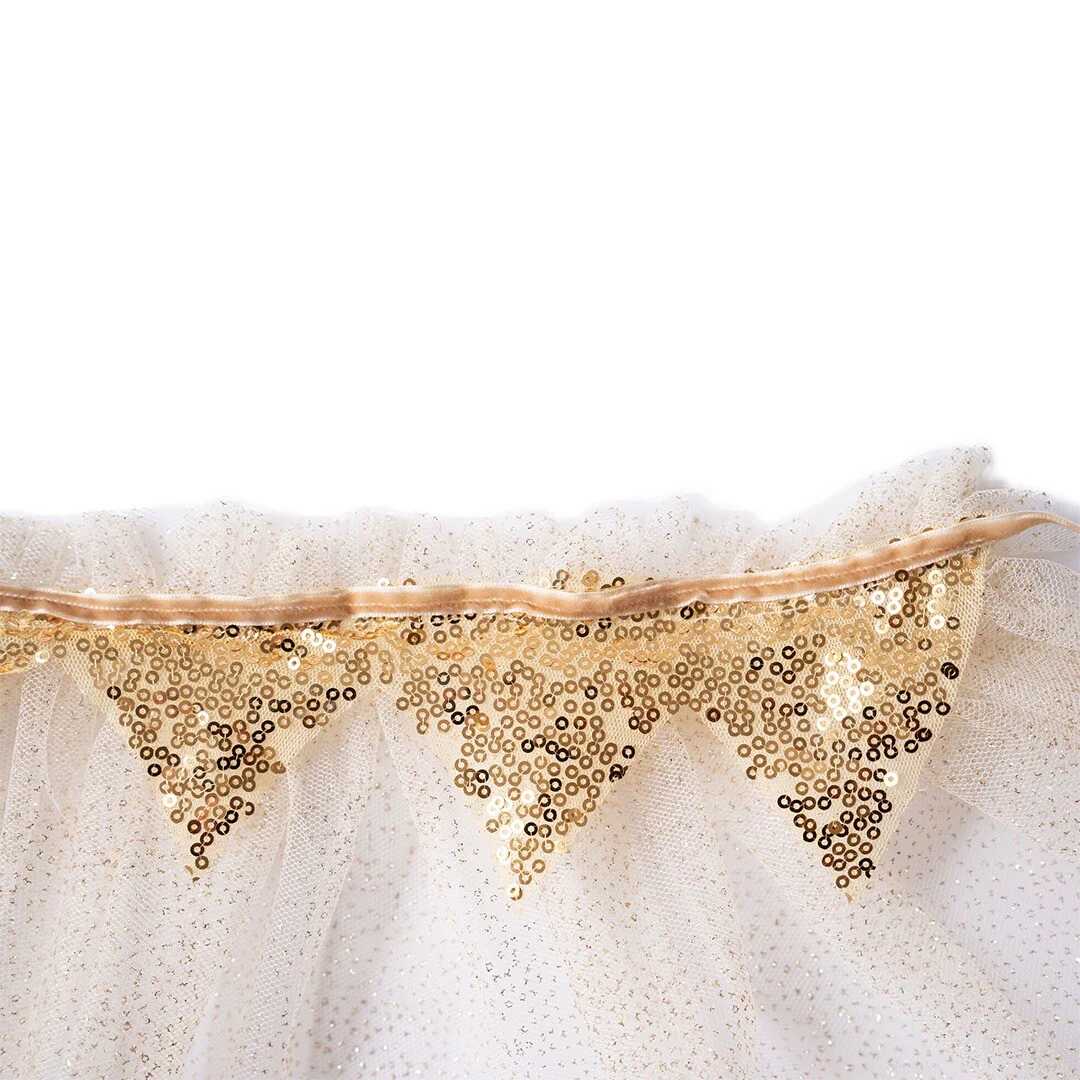 De tule stof geeft de verkleedcape een elegante uitstraling. De stof is subtiel gedecoreerd met gouden glitter en de kraag heeft gouden pailletten ter decoratie, dit maakt de cape feestelijk.