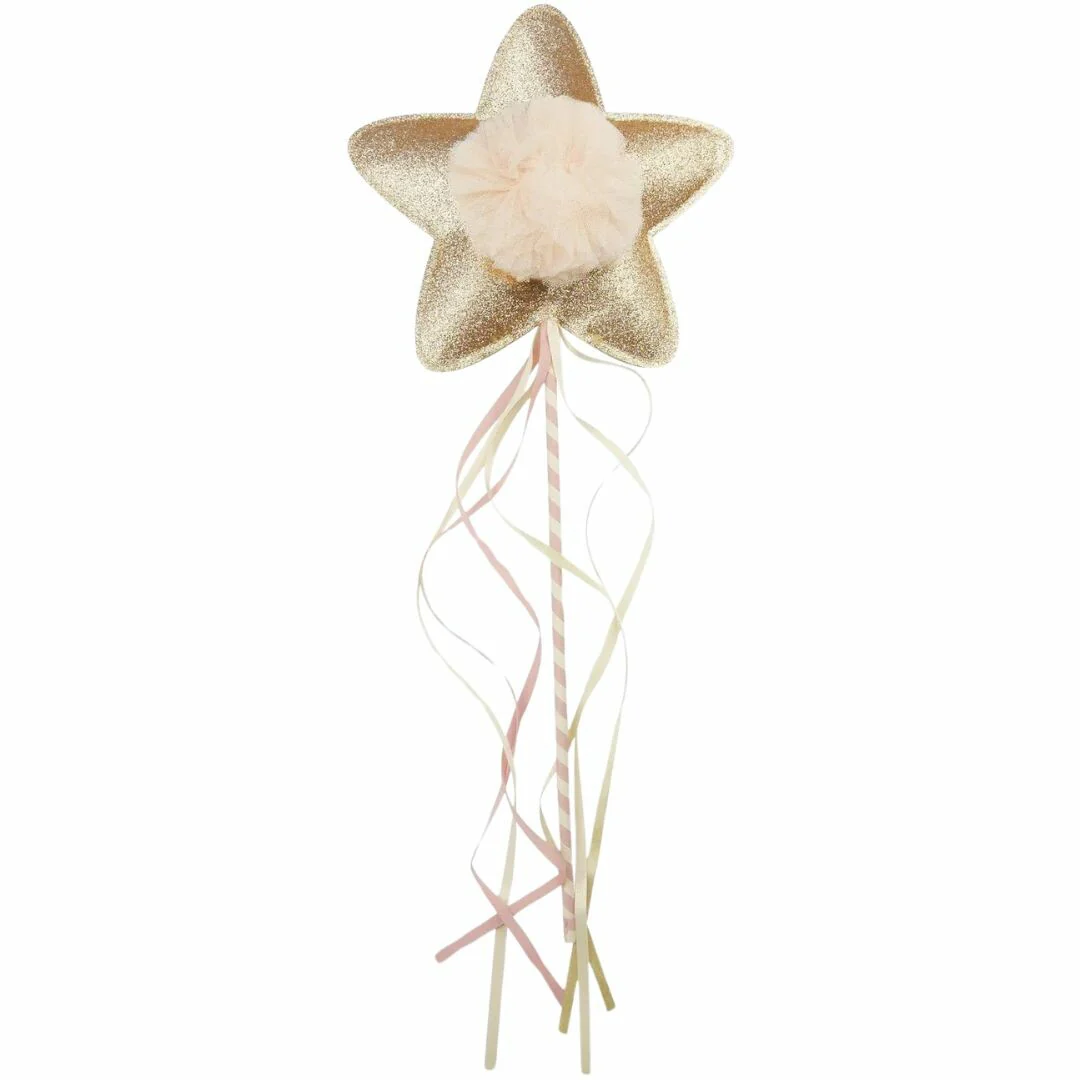 De toverstaf heeft een grote gouden glitterster gedecoreerd met een lichtroze pompom gemaakt van een tule stof. De toverstok is versierd met prachtige linten en is omwonden met wit-roze gedraaid lint met een speels effect.