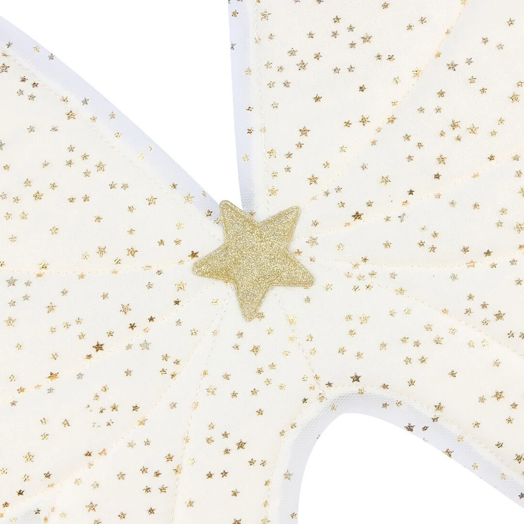 De stof van de vleugels is versierd met kleine gouden sterretjes. In het midden prijkt een grote gouden glitterster.