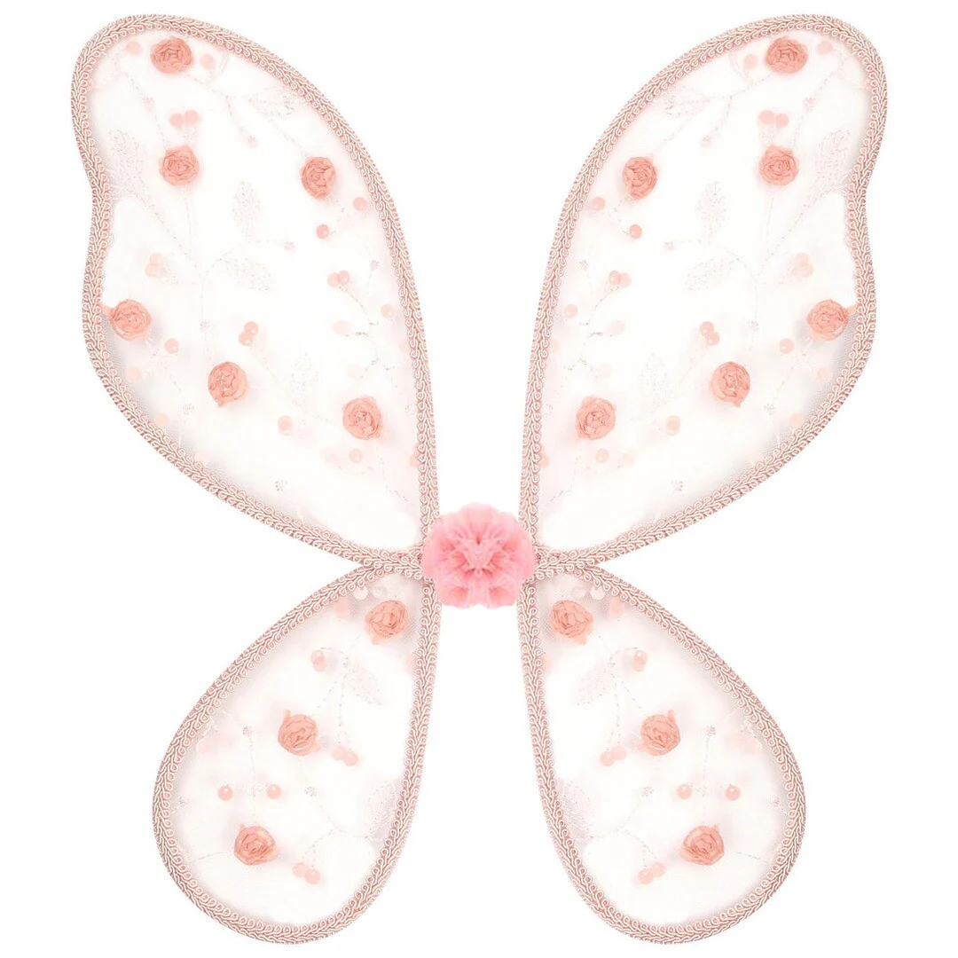 De vleugels zijn gemaakt van een doorzichtige stof geborduurd met prachtige roosjes en de randen zijn gedecoreerd met een rosé koord. De pompom in het midden is een echte eyecatcher.