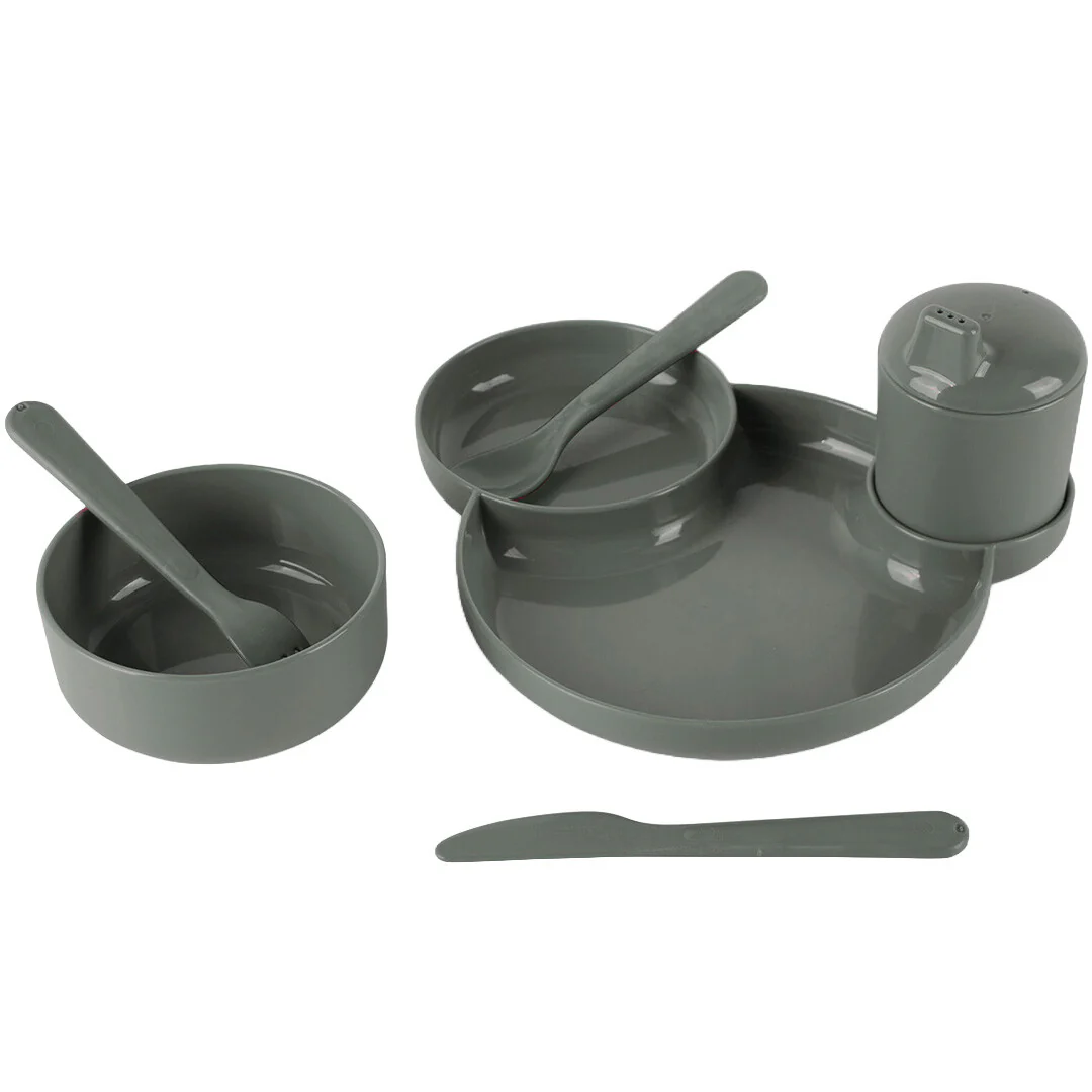 Dit kinderservies met aparte vakjes ‘Tiny Biobased Dinner Gift Set – Olive’ van het Deense merk Dantoy heeft alles bij de hand voor een gevarieerde maaltijd. De ecologische verantwoorde eetset bestaat uit een bord met twee vakjes, een kommetje, een tuitbeker en bestek.