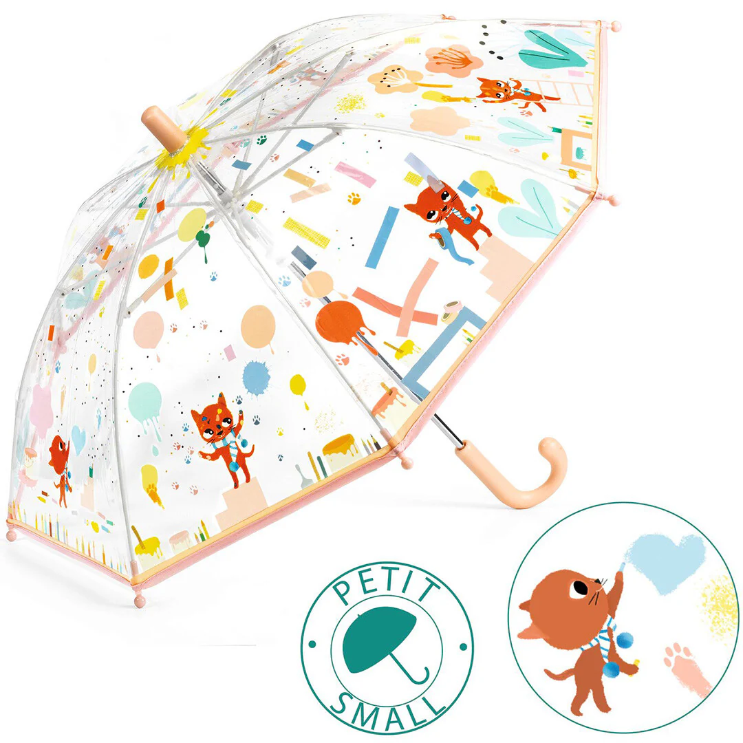 Een transparante kinderparaplu ‘Chamallow’ uit de serie Little Big Room van het Franse merk Djeco. De peuter stapt graag buiten in de regen met deze kinderparaplu vol poezen en katten.