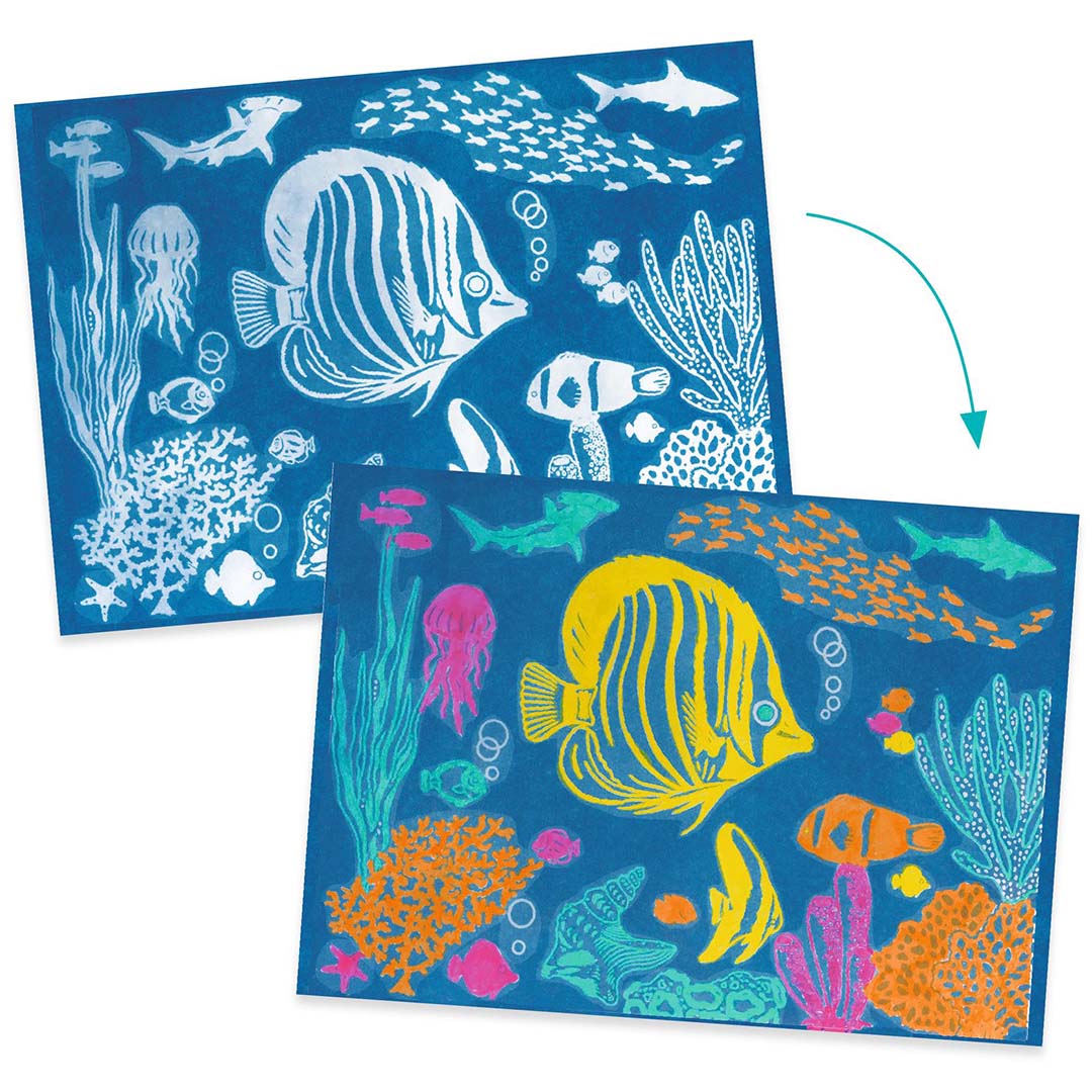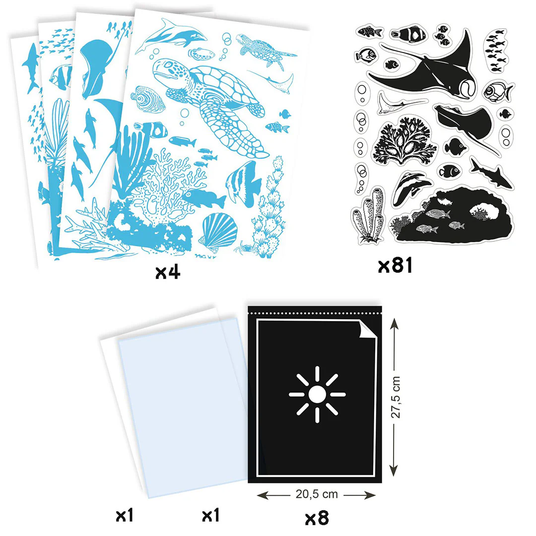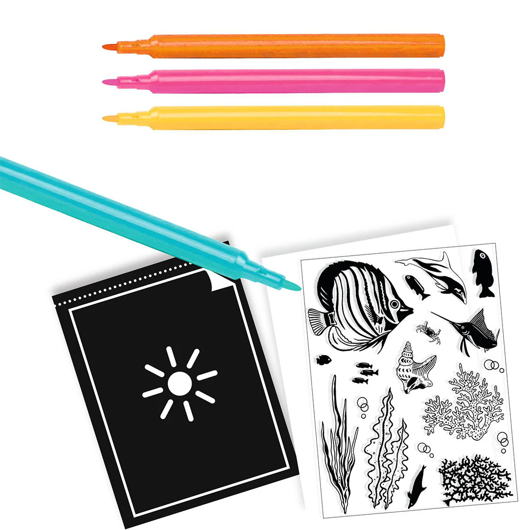 Met het creatieve speelgoed met bijgeleverde sjablonen, lichtgevoelige vellen en 4 vrolijke viltstiften bouw je een eigen oceaan vol fantasie.