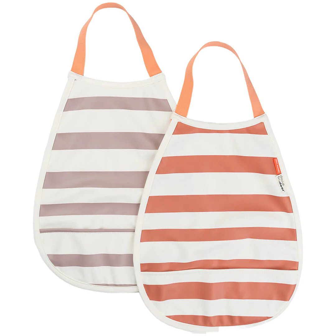 De slabbetjes hebben een voorvakje en een waterafstotende coating, zodat de outfit schoon en droog blijft. De ene kinderslab is oranje-wit gestreept, de andere slab is oudroze-wit gestreept. De slabbetjes zijn gemakkelijk om te hangen met het elastieken koord.