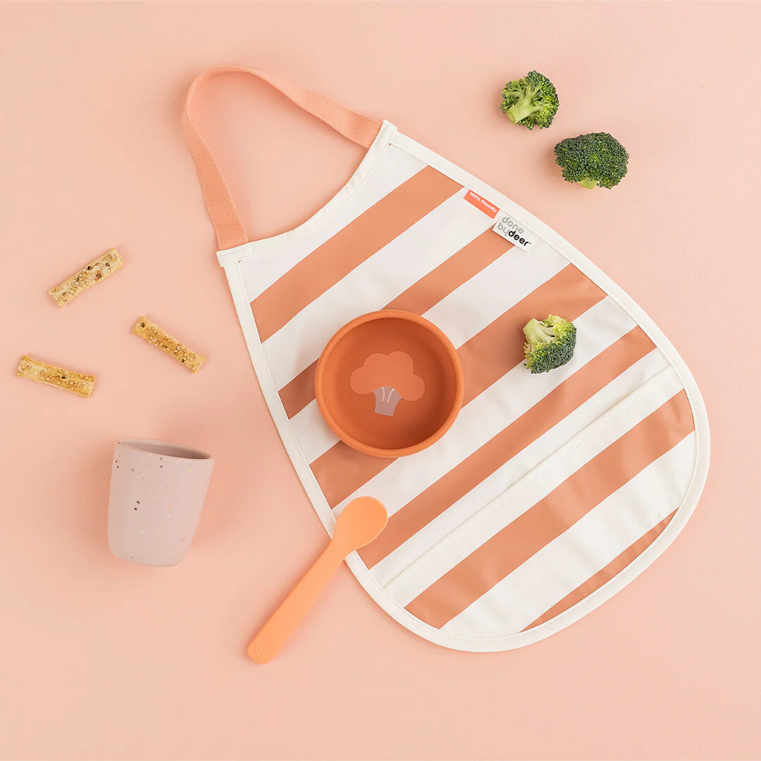 Een beetje kliederen tijdens het eten is geen probleem met deze pull-over kinderslabbetjes ‘Pull-over Bib – 2 Pack – Papaya/Powder’ van het Deense merk Done by Deer.