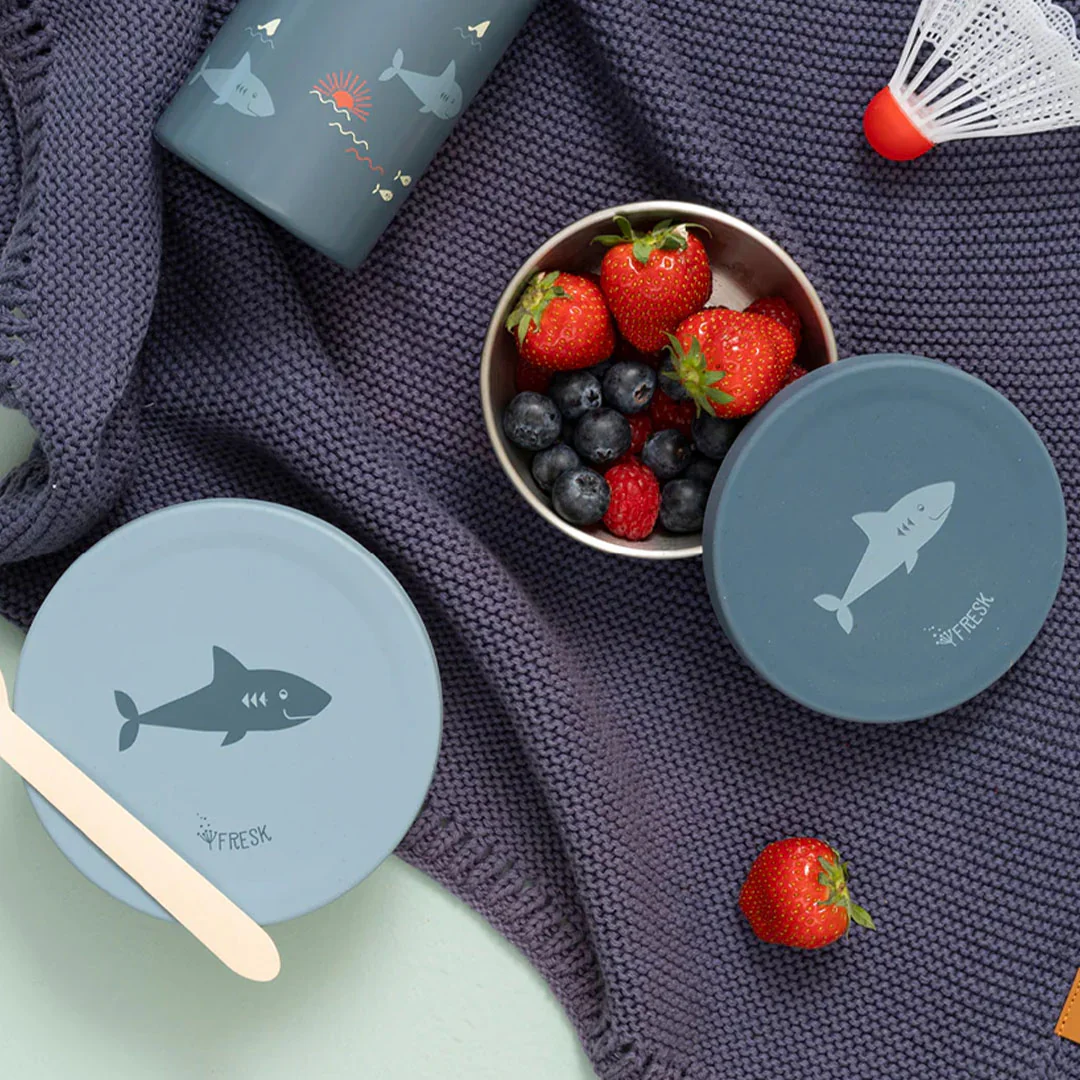 Ga op avontuur met snacks binnen handbereik met de snackdoosjes ‘Snack box set 2 pcs – Shark’ van het Nederlandse merk Fresk.