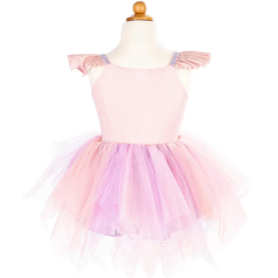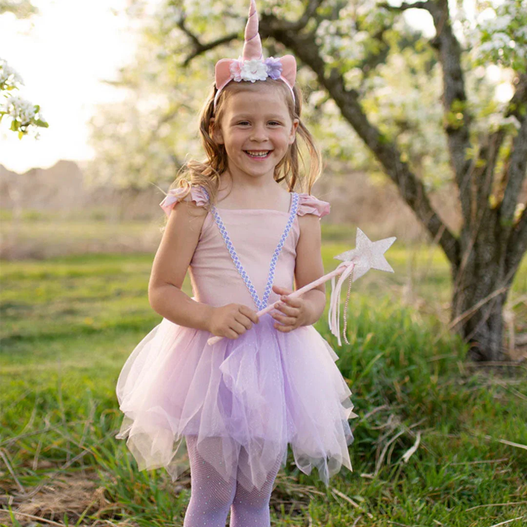 Het roze lijfje zit vol glinsterende paarse details, maar de gelaagde tule rok met glitters steelt de show. Om helemaal te transformeren tot sierlijke eenhoorn zet je de roze diadeem in het haar. Met glinsterende oortjes, roosjes en de onmisbare hoorn is de outfit helemaal compleet.
