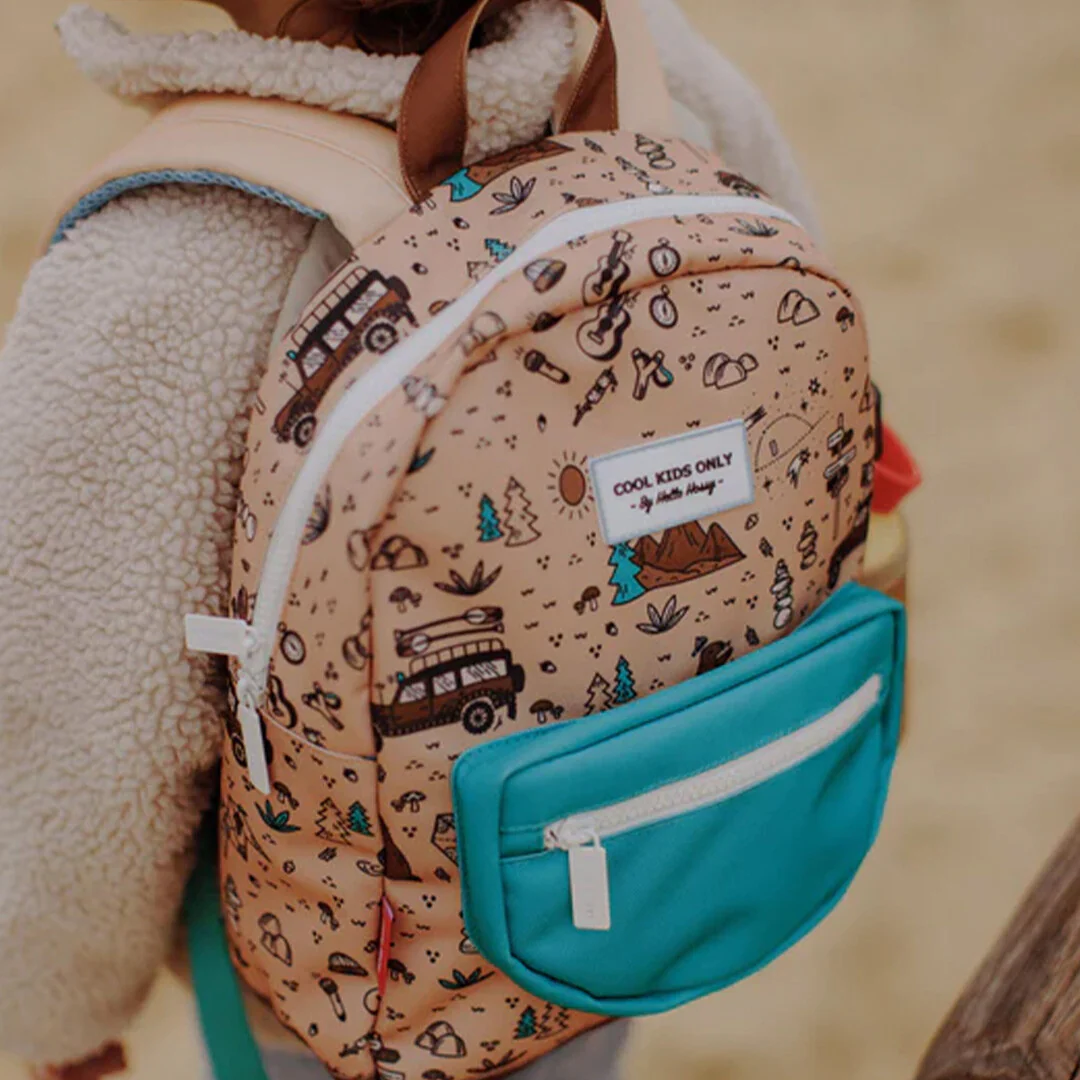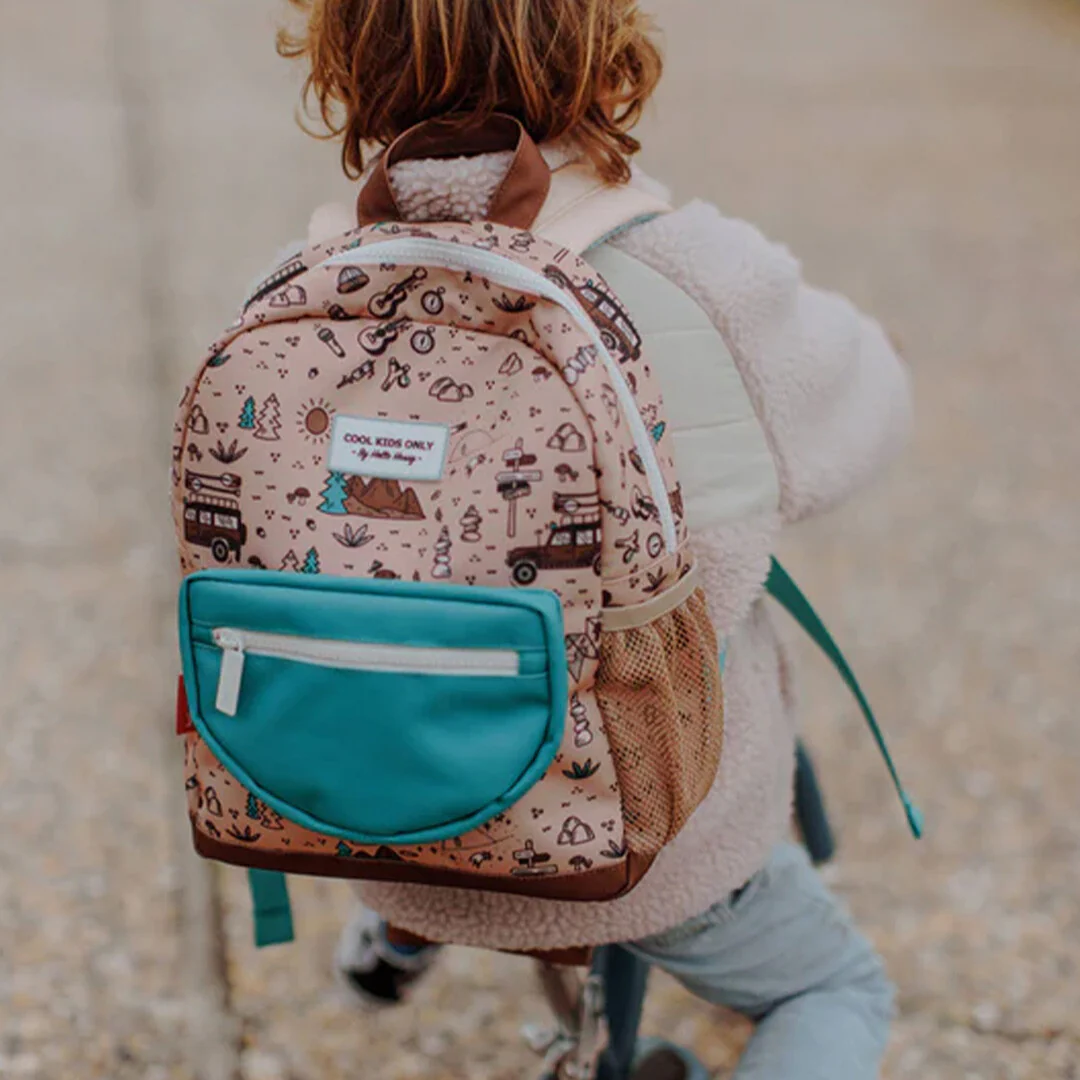 Een trendy kinderrugzak ‘Road Trip – 6+ ans’ van het Franse merk Hello Hossy voor naar school of voor een dagje uit. De tas heeft een dessin van een olijke bever in een Nordic landschap. Het vrolijke dessin, de contrasterende kleuren van voering, vakjes en afwerking geven de tas kleurrijke accenten.
