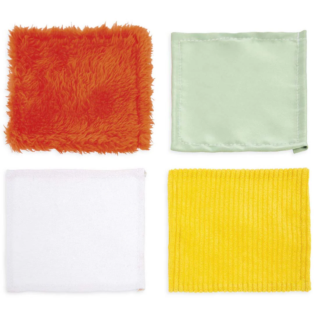 In de doos wachten ook 4 stoffen doekjes met verschillende texturen. Een glad lapje, een ruwe variant, een fluffy stof en een soepele doek. Handjes grijpen, trekken en proppen ze weer terug. Dat simpele spel prikkelt de tastzin en laat zien dat actie direct resultaat geeft. De houten deurtjes aan de zijkant openen makkelijk, zodat alle vormen snel weer tevoorschijn komen en het spel opnieuw begint.