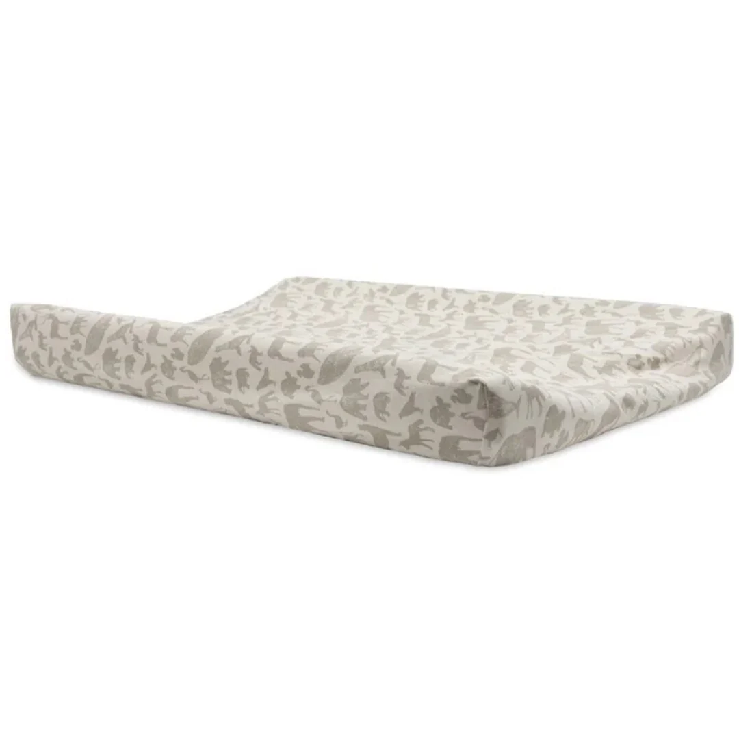 De aankleedkussenhoes van katoenen jersey is vriendelijk voor een babyhuidje en heeft een dessin vol dierensilhouetten.