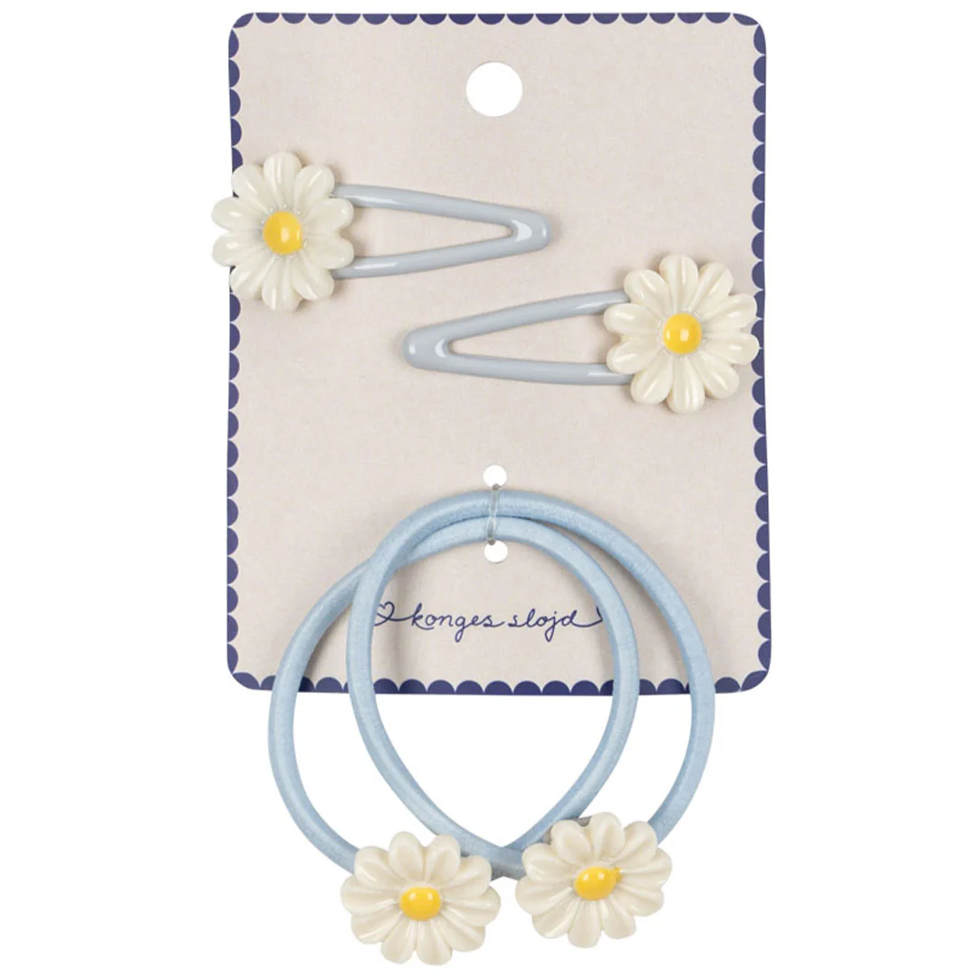 Elk van de 2 haarelastiekjes pronkt met een sierlijk madeliefje en de 2 haarclipjes in dezelfde stijl maken elke look compleet.