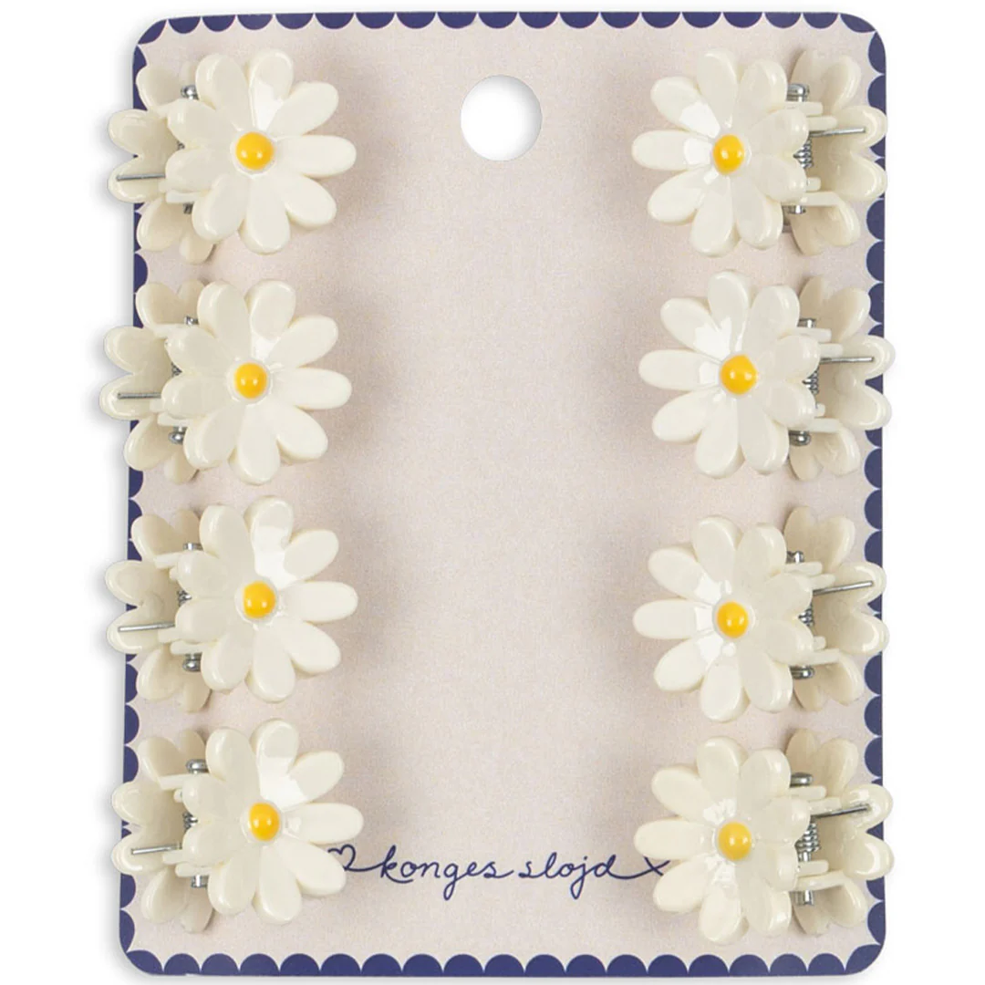 Maak van ieder kapsel een kunstwerkje met deze haarclipjes ‘8 Pack Mini Daisy Hair Claws’ van het Deense merk Konges Sløjd. Op de haarclipjes prijken sierlijke madeliefjes, klaar om elke look een vrolijke boost te geven!