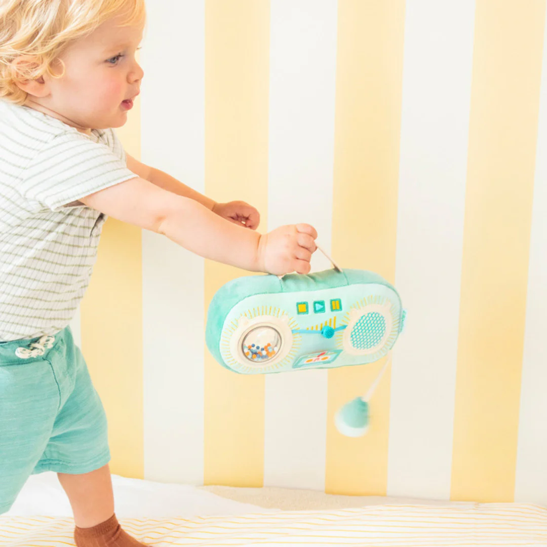 De kleine kan comfortabel spelen en genieten van deze zachte radio die aanvoelt als een knuffel. Dit babyspeelgoed bevat een zachte microfoonrammelaar, knisperende elementen en maar liefst 7 vrolijke geluidjes die je uit of aan kan zetten. Dit alles zorgt voor speelplezier en stimuleert tegelijk de zintuigen en motorische ontwikkeling.