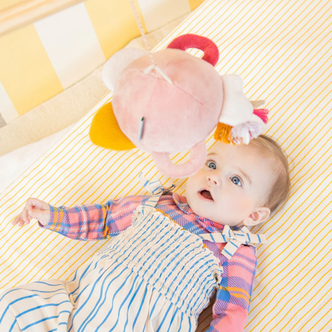 Met het lusje bovenop de eenhoorn is het babyspeeltje aan een babyzitje, kinderwagen of box vast te maken.