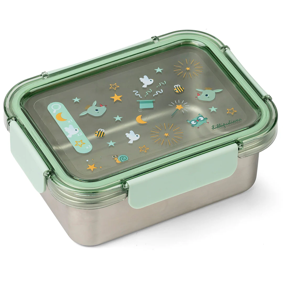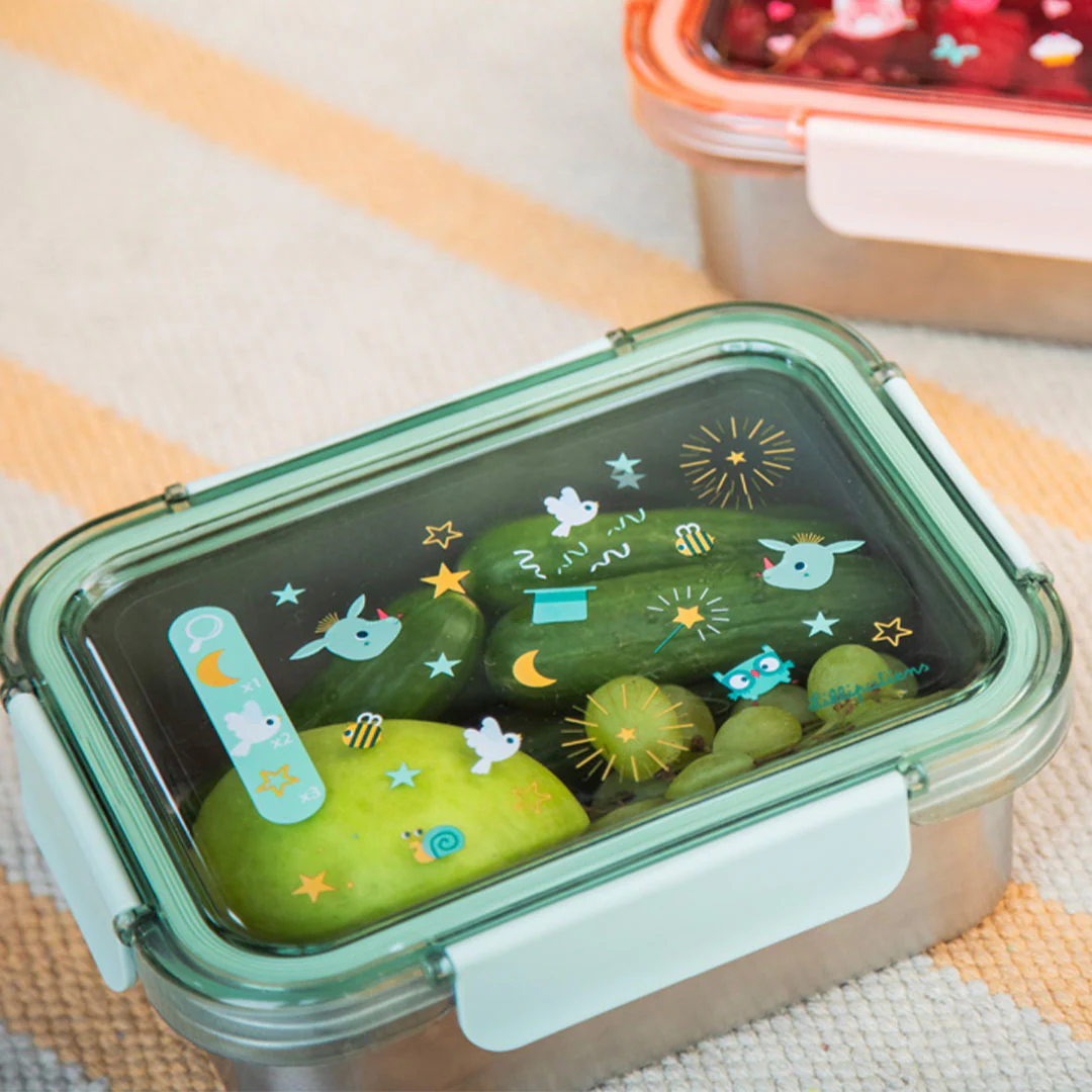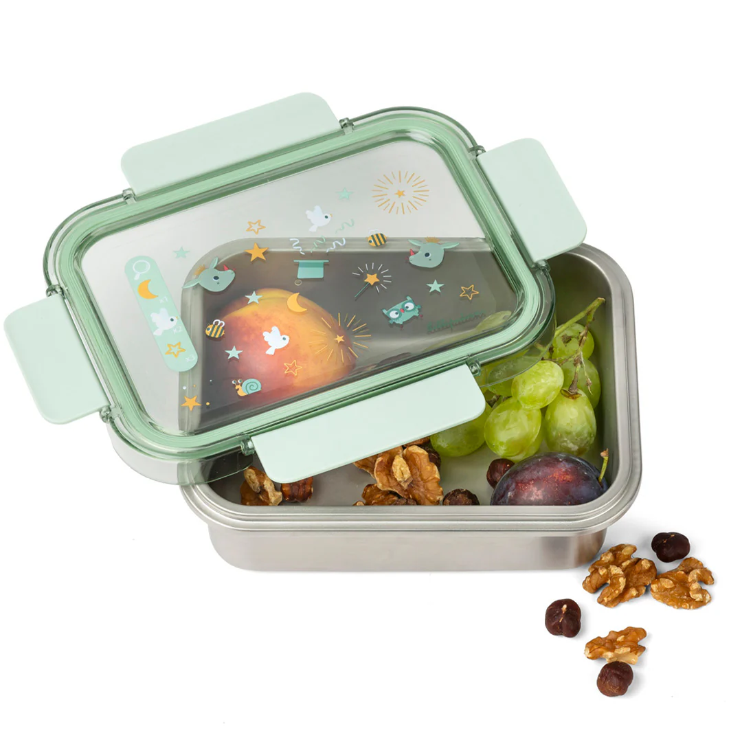 Deze roestvrijstalen lunchbox is licht van gewicht en heeft een doorzichtig lichtgroen deksel met vrolijke illustraties. De trommel sluit goed af met een deksel waaraan aan alle kanten een klikflap zit, waardoor het doosje naadloos afsluit en maaltijden vers houdt.