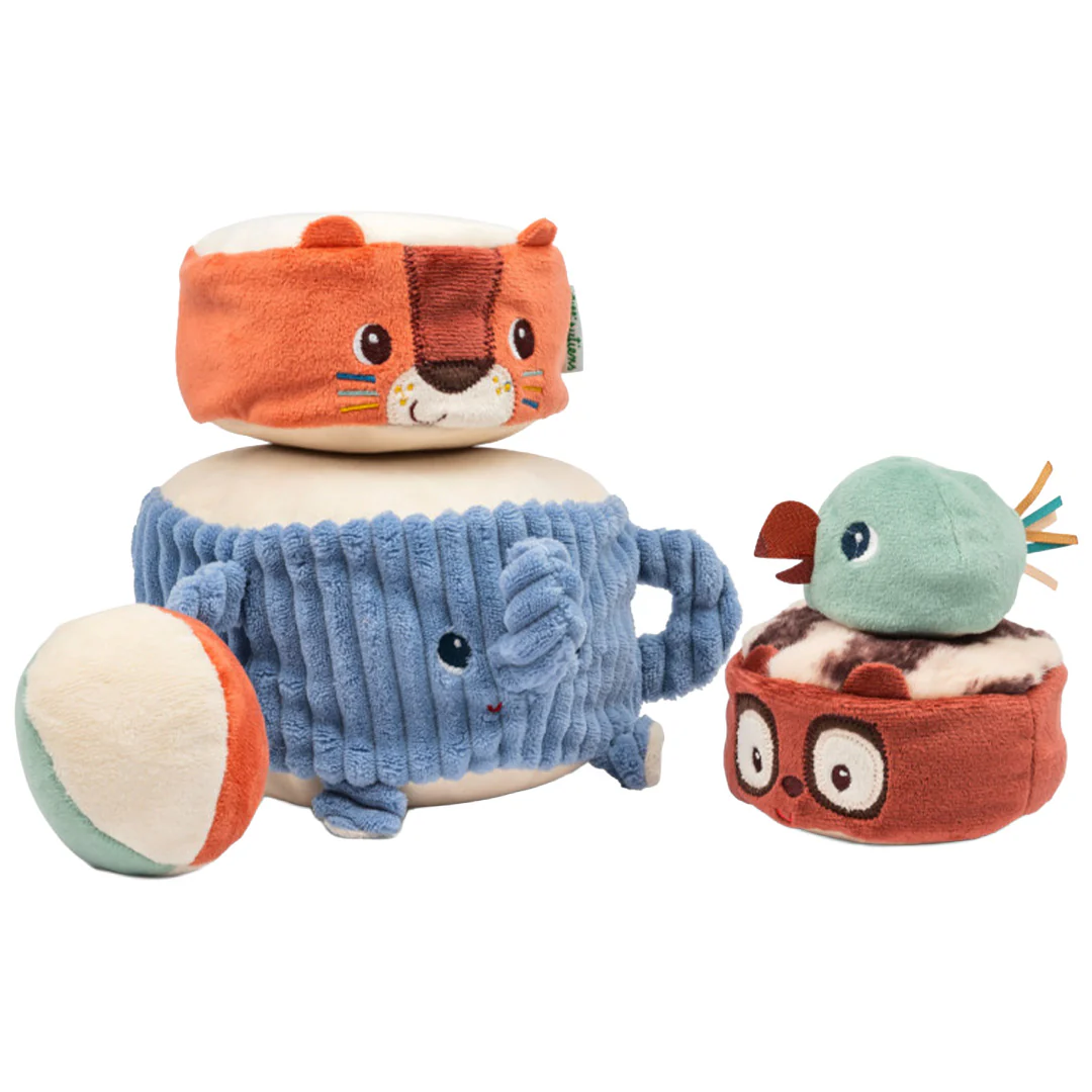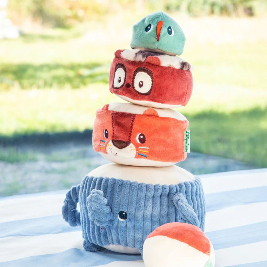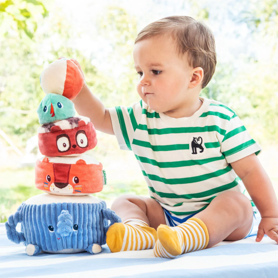 Tijdens het stapelen ontdekken kleine handjes verschillende texturen en verborgen geluidjes en genieten ze van het bouwen en opnieuw omgooien. Dit prikkelt de zintuigen en stimuleert het gehoor. Daarbij helpt het met de ontwikkeling van hand-oogcoördinatie, motoriek en inzicht in balans.