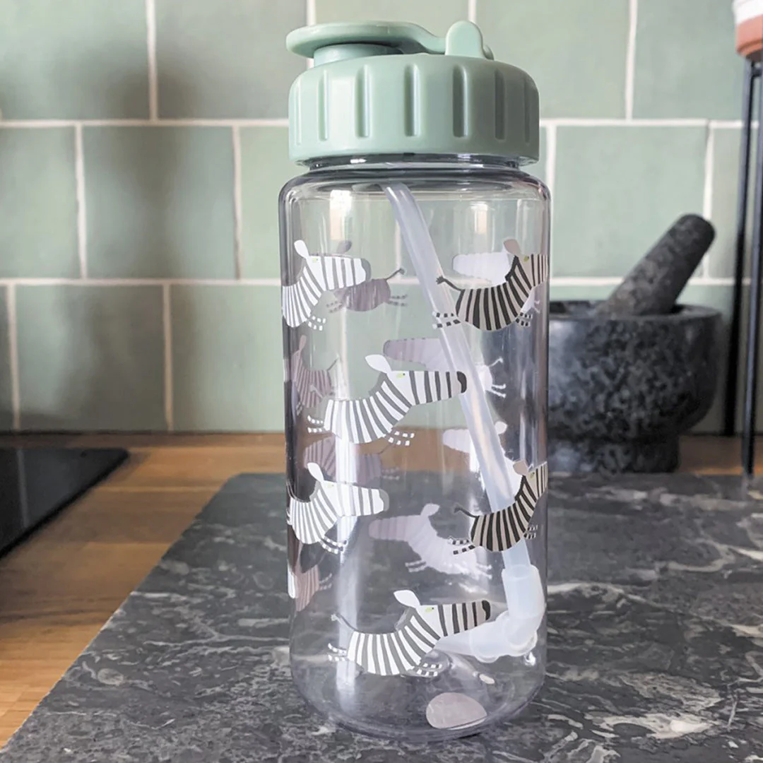 De transparante fles vol met je favoriete dieren uit de savanne maakt elke slok drinken een feestje! De bijgeleverde groene dop heeft een rietje waardoor het drinken nog makkelijker wordt.