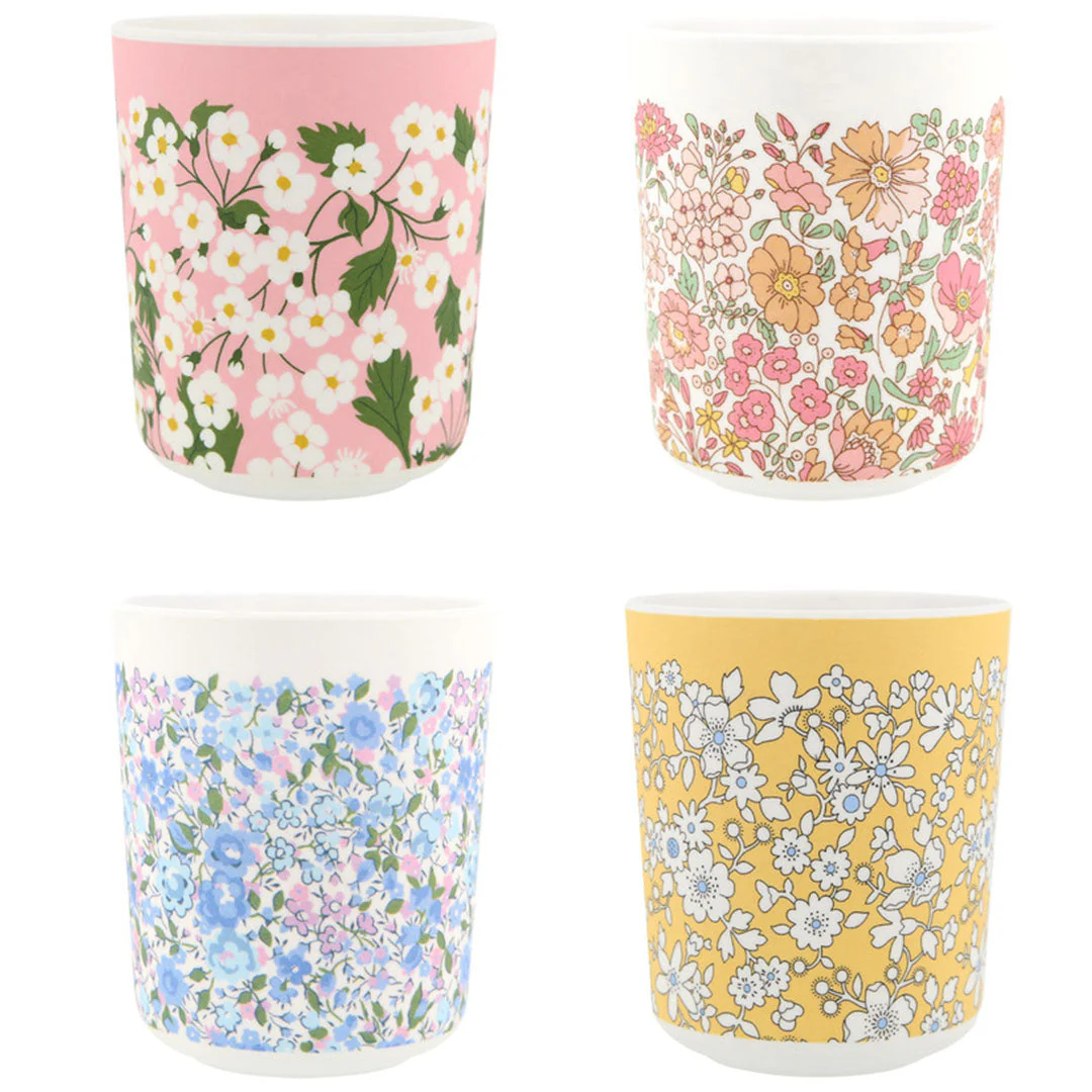 Deze bekers zijn een samenwerking tussen Meri Meri en het iconische Liberty, bekend van de klassieke bloemendessins. Elk van de 4 bekers heeft een ander klassiek bloemendessin in zomerse kleuren.