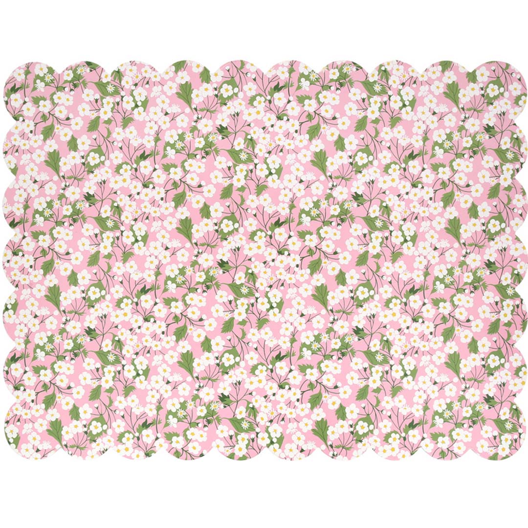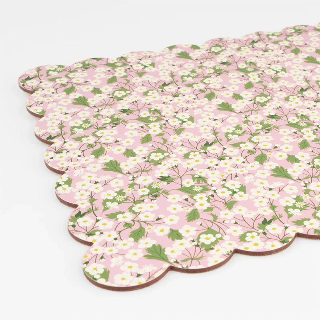 De placemat is een samenwerking tussen Meri Meri en het iconische Liberty, bekend van de klassieke bloemendessins. Een bloemendessin met kleine witte bloemetjes op een roze achtergrond siert de placemat en de golvende rand zorgt voor een elegante uitstraling.