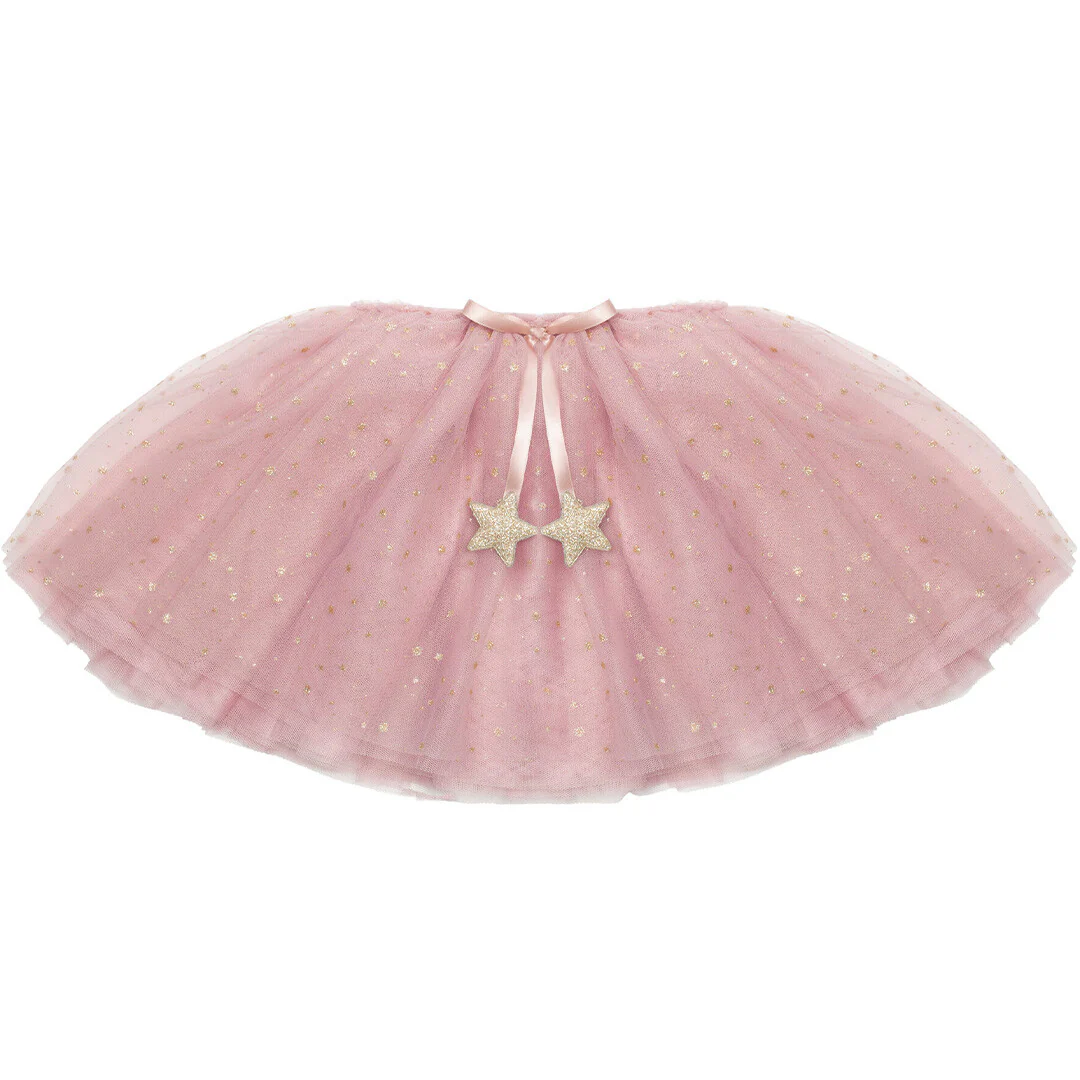 Het tule kinderrokje is bezaait met gouden glitters en heeft aan de voorkant een strikje met gewatteerde sterren. De rok heeft een elastieken tailleband en bestaat uit verschillende lagen tule. Ideaal voor verkleedfeestjes, alledaags of voor een feestelijke gelegenheid.