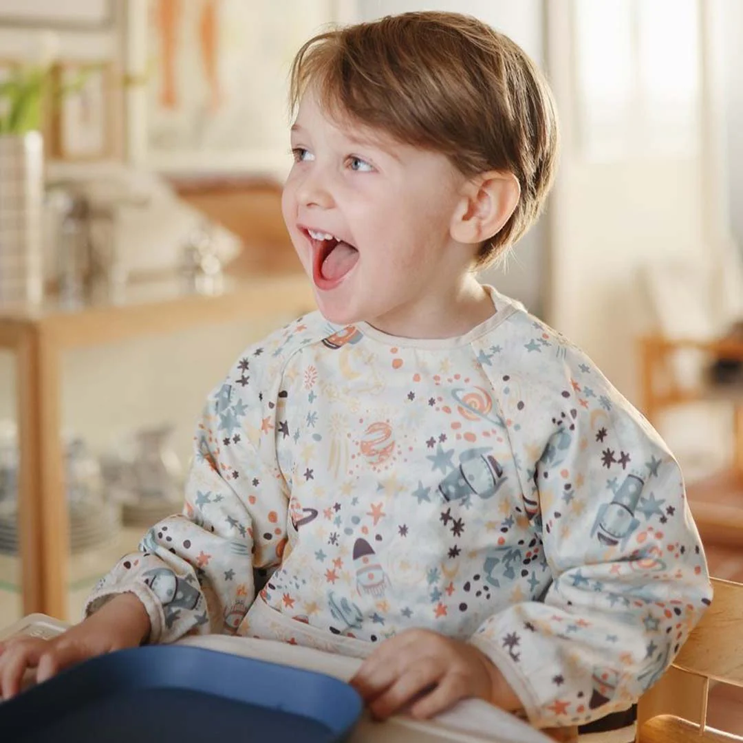 Met deze stoere mouwslab ‘Space’ van het Amerikaanse merk Mushie wordt de kans op vlekken wel heel erg klein. Kleine eters genieten volop van de maaltijd terwijl ze beschermd zijn tegen morsen.