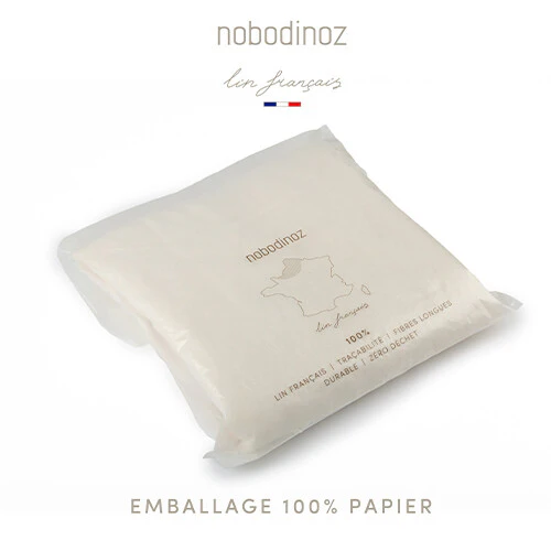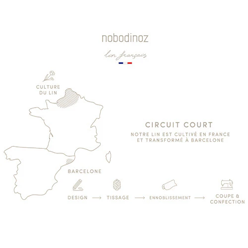 De milieuvriendelijk geproduceerde Lin Français collectie van Nobodinoz wordt gemaakt van Frans vlas dat wordt verwerkt tot linnen in Barcelona. Dankzij een uitmuntende kennis van stofafwerking voelt het linnen aan als een zachte en verfijnde stof: als een wolk van zachtheid. Door het gebruik van lange vlasvezels ontstaat er een flexibele, duurzame stof van hoogwaardige kwaliteit die niet pilt. Het linnen is hypoallergeen, antibacterieel en heeft een hoge vochtopname.