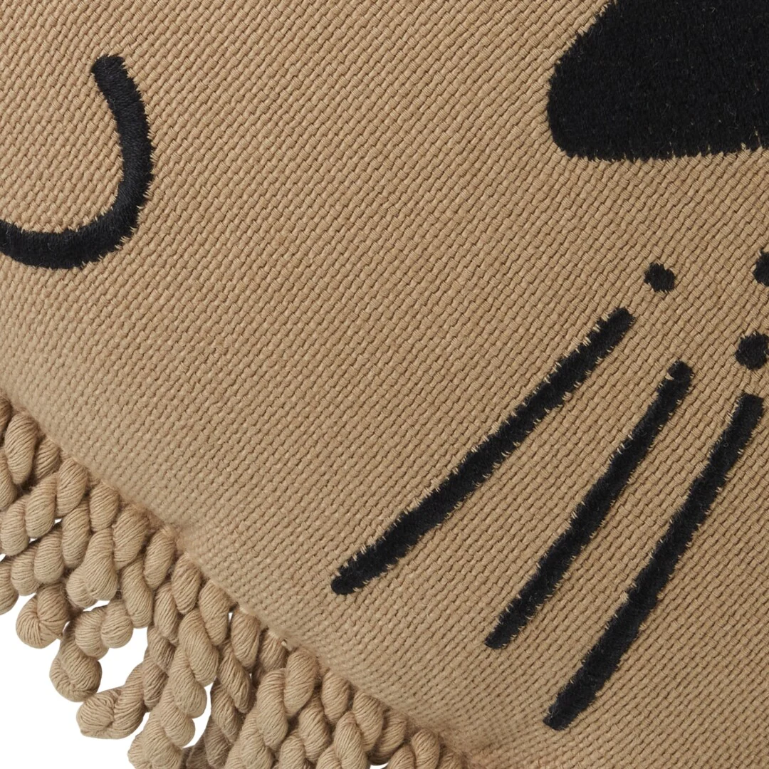 Een katoenen sierkussen met geborduurde leeuwensnoet en gevlochten manen ‘Lion Face Embroidery Cushion’ van het Spaanse merk Nobodinoz. Een kinderkussen met speelse allure dat comfort biedt op de bank of op bed.