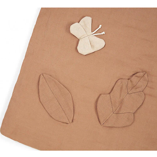 Op de zachte speelmat van verfijnd linnen kunnen baby’s liggen, kruipen, spelen en verkennen. Het duurzame activiteitenkleed heeft flapjes van vlinders en blaadjes die voor de baby interessant zijn om te zien en aan te raken.