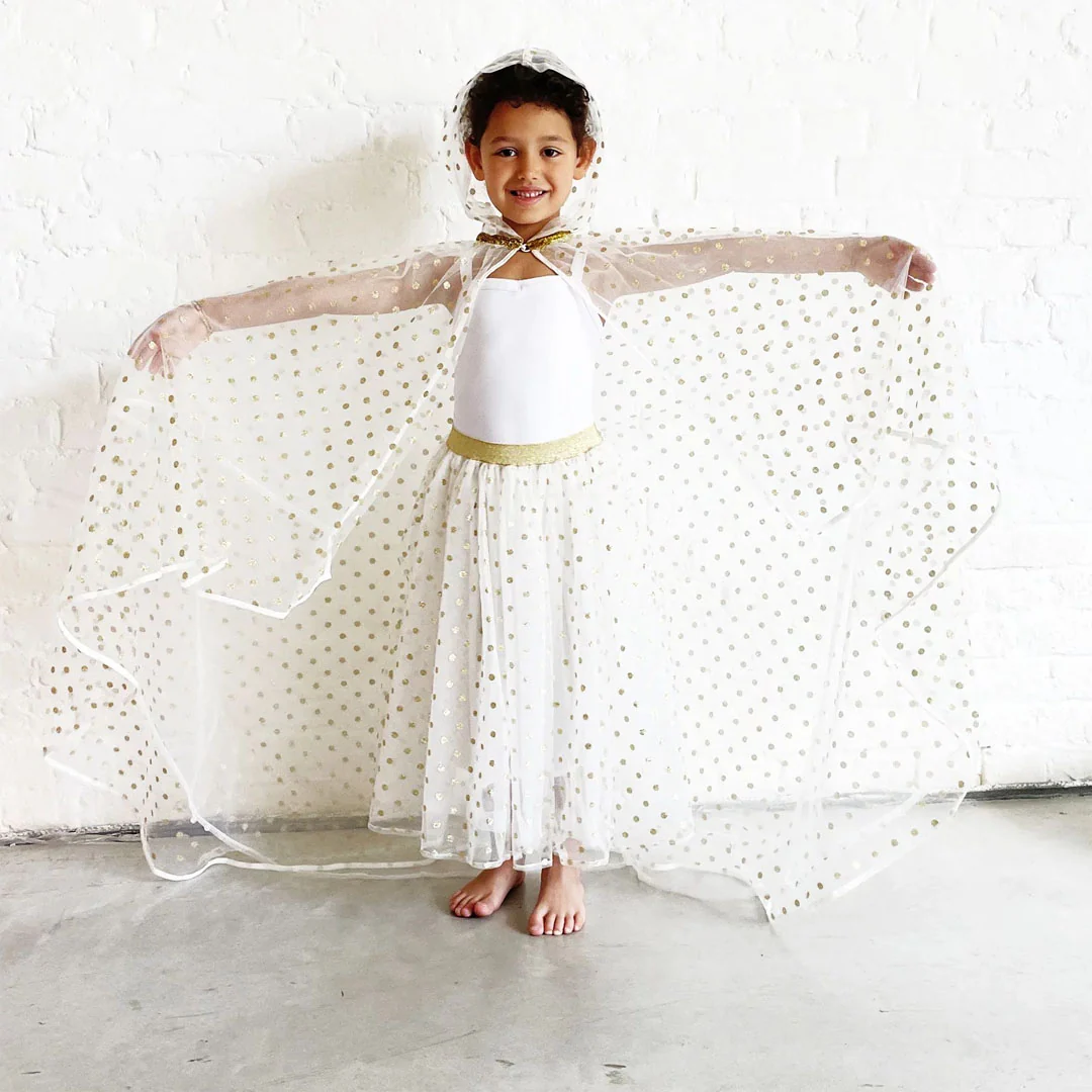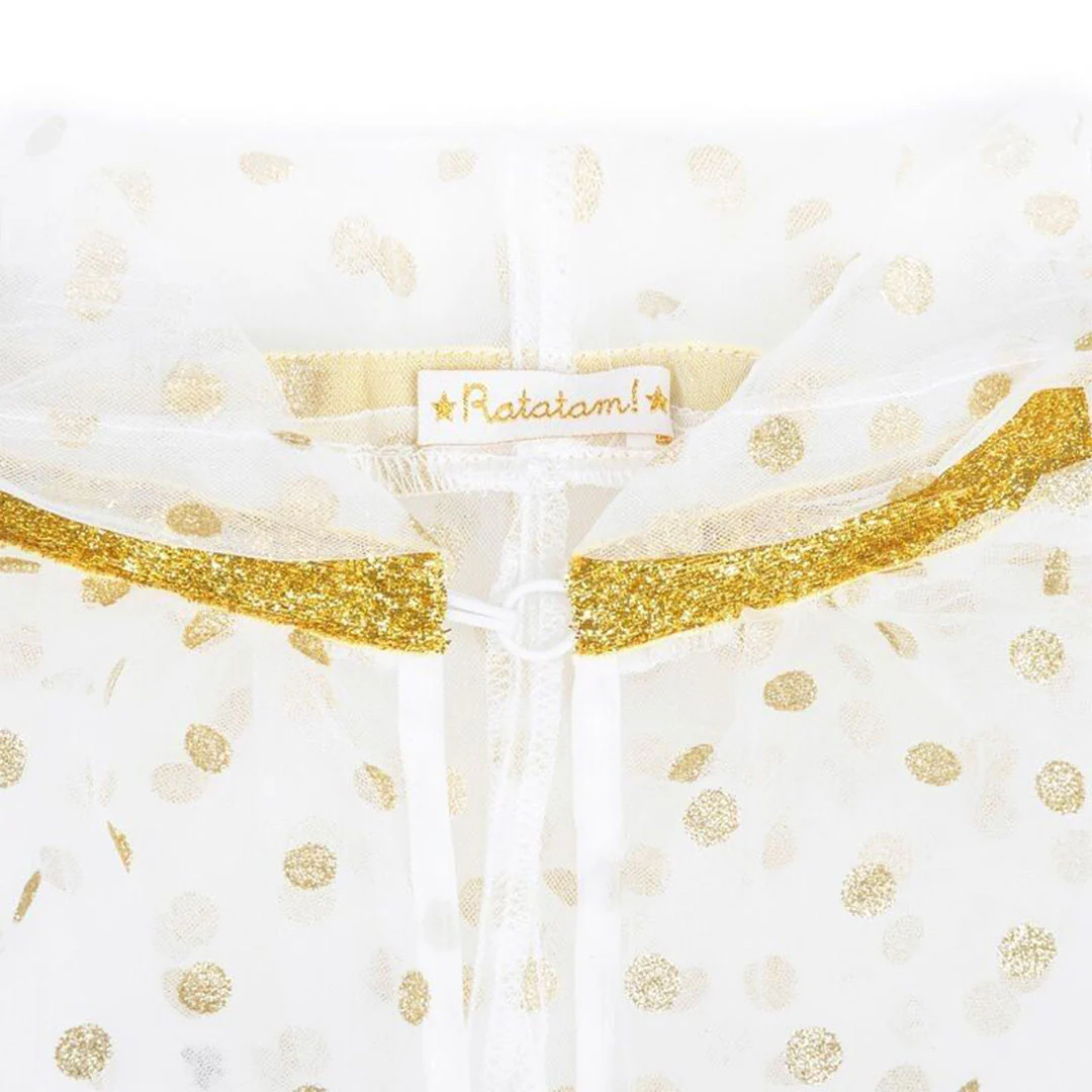Om de look van fee, prinses of elf extra glans te geven mag deze verkleedcape ‘Glitter Polka Dot Cape – Gold’ van het Franse merk Ratatam niet ontbreken. Een must-have voor feestjes en verkleedpartijen.