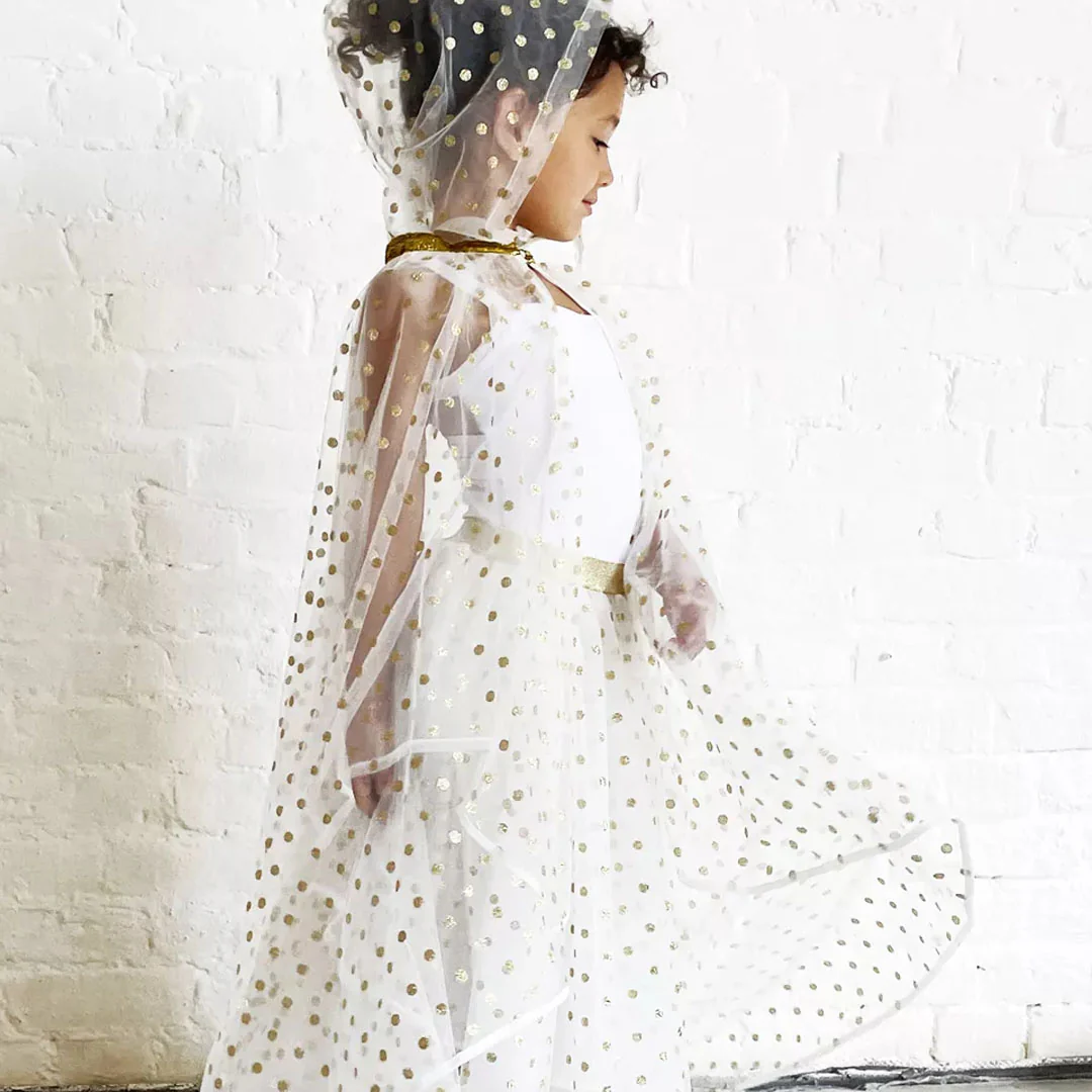 Deze sprankelende verkleedcape is versierd met gouden stippen en een glinsterende gouden kraag. De cape sluit rondom de nek met een handige haak-oog sluiting, waardoor hij perfect op zijn plek blijft tijdens het spelen.