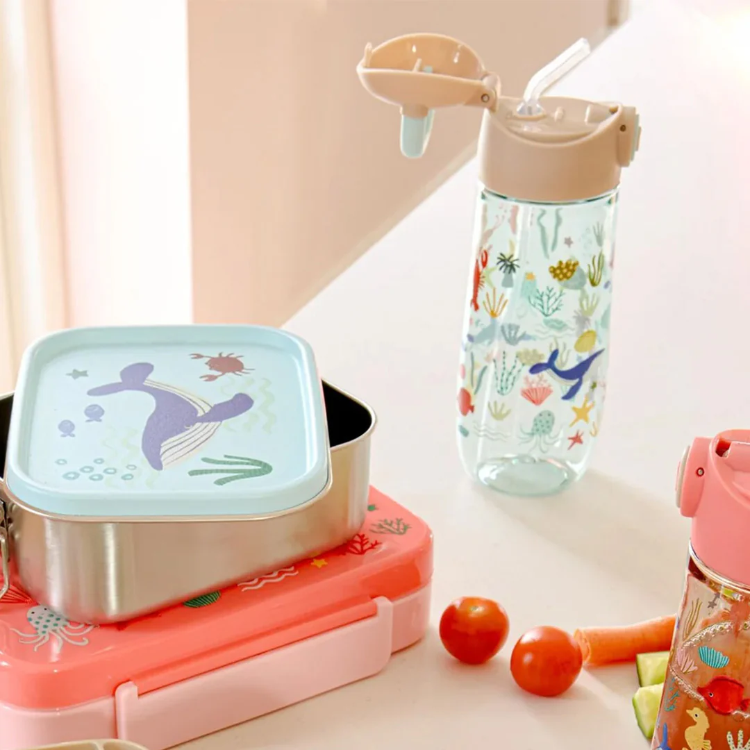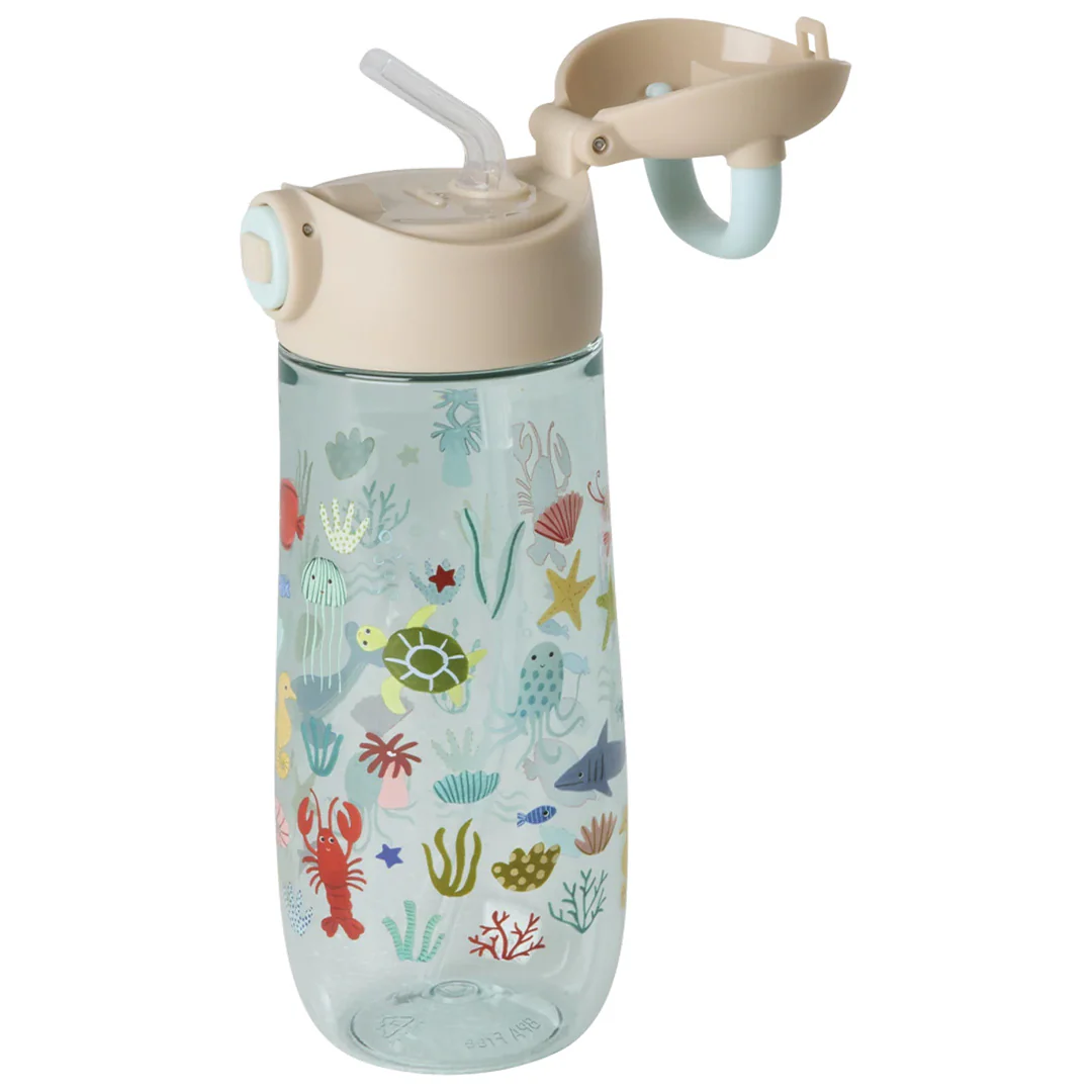 Met de transparante drinkfles ‘Tritan Bottle – Blue Ocean Print’ van het Deense merk Rice neem je drinken gemakkelijk mee naar school of op avontuur. De kleurrijke oceaanillustraties vrolijken elke slok op, of het nu tijdens een schooldag is of onderweg tijdens een uitstapje.