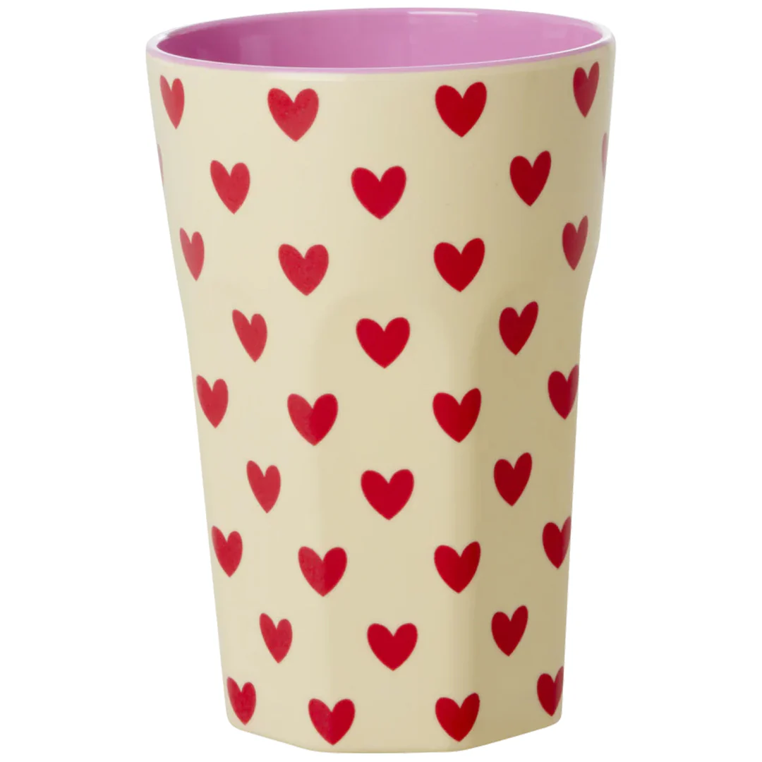 Drink favoriete drankjes uit deze hoge beker ‘Melamine Cup with Darling Hearts Print – Large – 400 ml’ van het Deense merk Rice met rode hartjes aan de buitenkant en een zachte roze kleur aan de binnenkant.