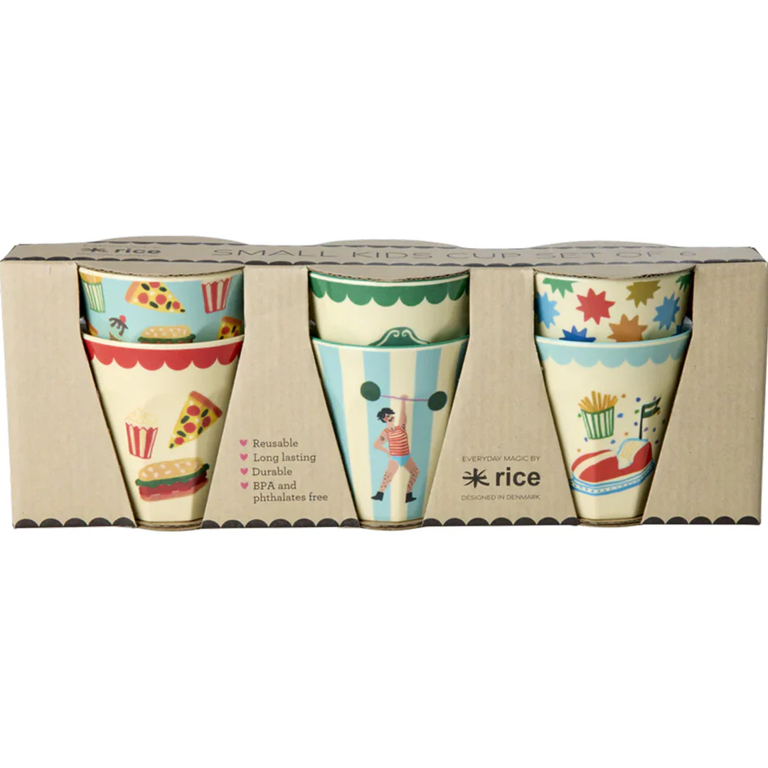 Deze set van 6 kinderbekers ‘Melamine Kids Cup with Fun Fair Print – Mint – Small – 6 Pack’ van het Deense merk Rice brengt meteen kleur en plezier op tafel. Elke beker heeft een eigen speelse illustratie met vrolijke figuurtjes en patronen, waardoor drinken elke keer weer een klein feestje wordt.