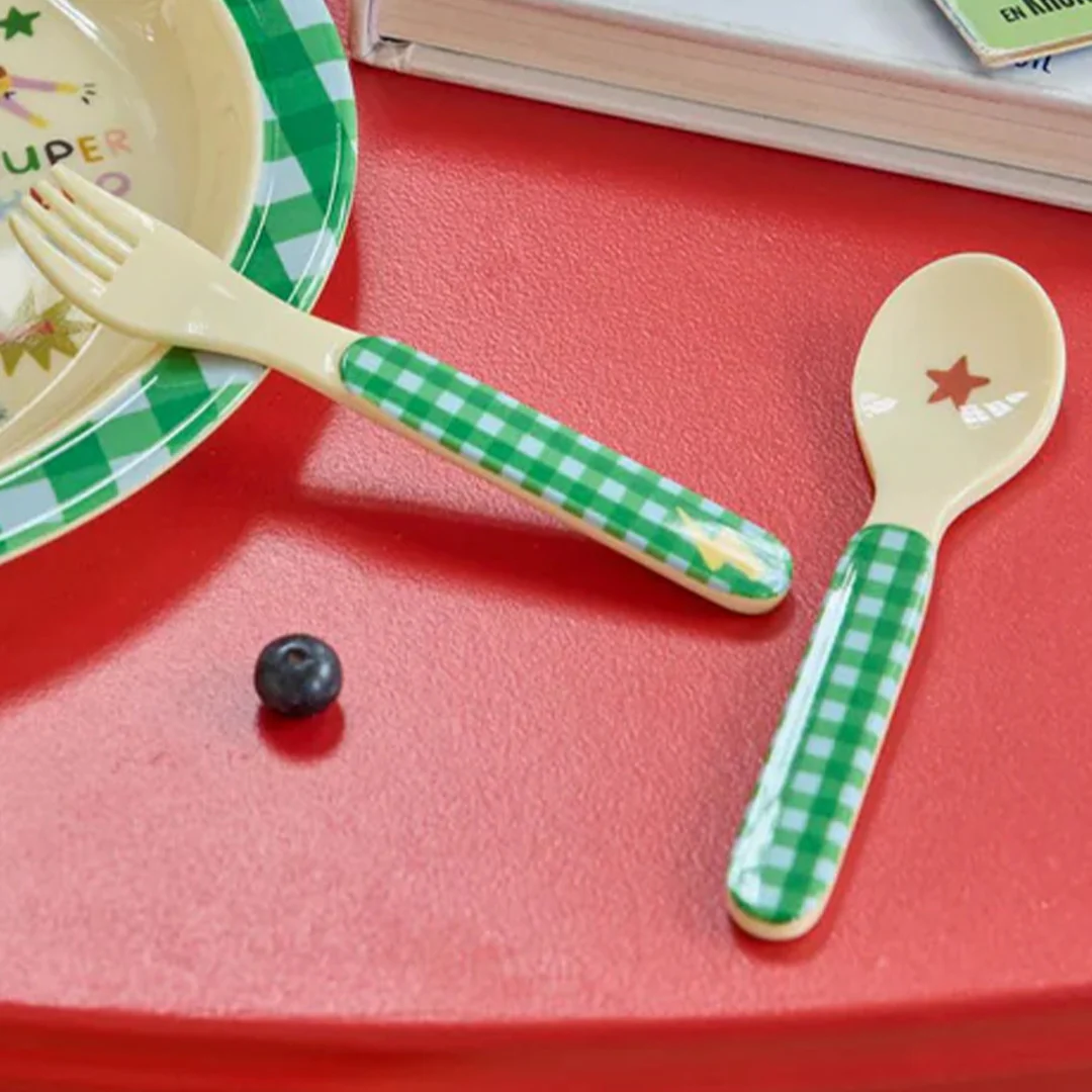 Met dit kinderbestek ‘Kids Melamine Spoon and Fork with Hero Print – Green’ van het Deense merk Rice krijgt elke hap een eigen heldenmoment. De frisse groene kleur en de speelse Hero-illustraties maken van eten een herkenbaar en vrolijk ritueel aan tafel.