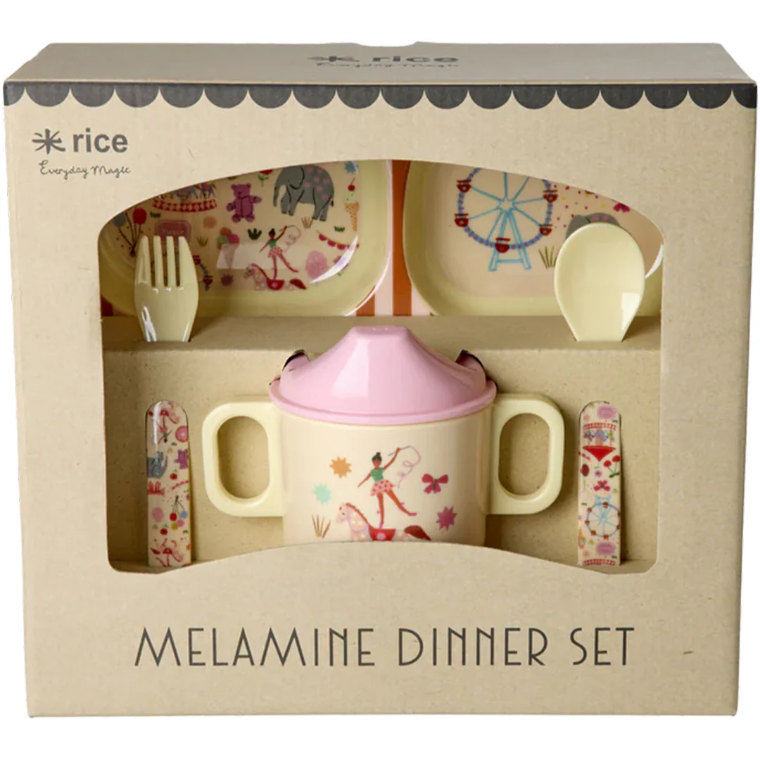 Met dit kinderservies ‘Melamine Baby Dinner Set in Giftbox – Fun Fair Print – Pink – 4 pcs’ van het Deense merk Rice begint elk eetmoment als een klein feestje aan tafel. De set komt in een mooie geschenkdoos en valt op door de zachte roze kleur en de speelse illustraties die meteen de aandacht trekken.