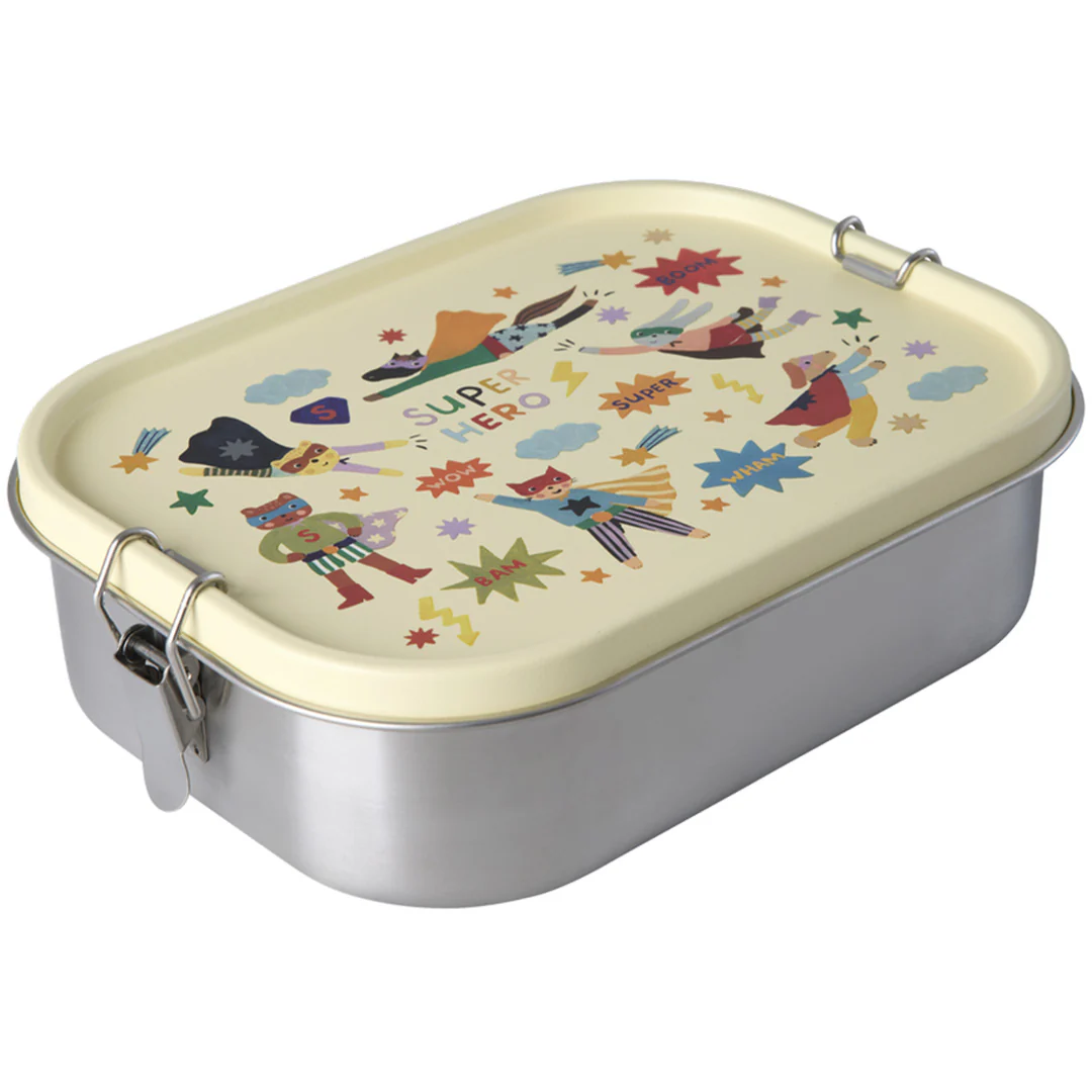 Met de broodtrommel ‘Large Stainless Steel Lunch Box – Cream – Hero Print’ van het Deense merk Rice gaan lunch en tussendoortjes veilig en vrolijk mee op pad.