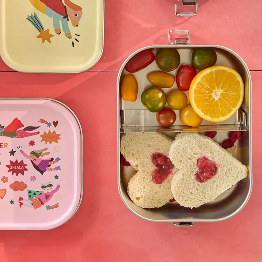 Met de broodtrommel ‘Large Stainless Steel Lunch Box – Pink – Hero Print’ van het Deense merk Rice gaan lunch en tussendoortjes veilig en vrolijk mee op pad.