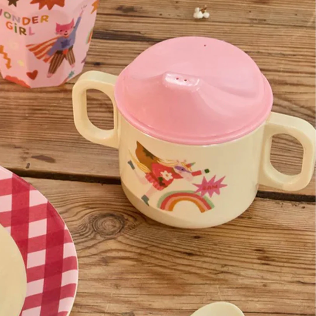 Met deze tuitbeker ‘Melamine 2 Handle Baby Cup with Hero Print – Pink- 250 ml’ van het Deense merk Rice wordt zelfstandig drinken een vrolijk moment. De kinderbeker heeft een zachte roze kleur en een speels heldenthema dat meteen aanspreekt bij kleine ontdekkers. Dankzij de handige tuit en twee oortjes ligt de beker prettig in kleine handjes.