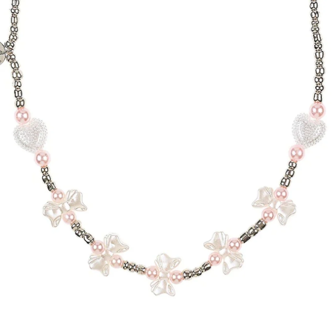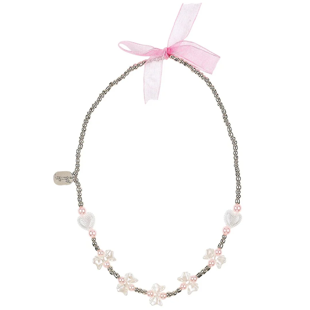 Verfraai de outfit met deze kinderketting ‘Amberly’ van het Nederlandse merk Souza for Kids. De feestelijke ketting met zilveren kraaltjes is versierd met witte strikjes- en hartjeskralen en roze kunstpareltjes.