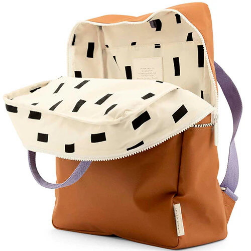 Een kinderrugzak ‘Uni – Buddy Brown’ van het merk Sticky Lemon met een body van gerecyclede PET-flessen en waterdichte voering met zwarte ‘sprinkles’.