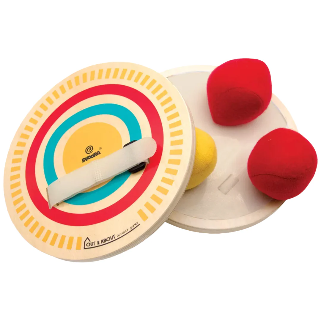 Dit actiespel kun je met zijn tweeën spelen, of meer als de anderen de ballen gooien. Dankzij het klittenband blijven de ballen goed plakken, wat zorgt voor een fijne speelervaring en succesmomenten tijdens het gooien en vangen. De set bestaat uit twee houten vangschijven met ergonomische handgrepen en een stevig klittenbandoppervlak, gecombineerd met 3 zachte stoffen ballen.